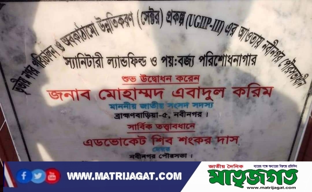 হেবজুল বাহার নবীনগর ব্রাহ্মণবাড়িয়া প্রতিনিধিঃ ২০/৫/২০/০৫/২০২২ততীয় নগর পরিকল্পনা ও অবকাঠামো উন্নতি করণ (সেক্টর) প্রকল্প (UGIIP-III)এর আওতায় ৮কোটি টাকা ব্যয়ে ব্রাহ্মণবাড়িয়ার নবীনগর পৌরসভাধীন স্যানিটারী ল্যান্ড ফিল্ড ও পয়ঃ বর্জ্য পরি শোধনাগারের উদ্বোধন করেন বিকন এর স্বত্বাধিকারী মোহাম্মদ এবাদুল করিম বুলবুল এমপি।