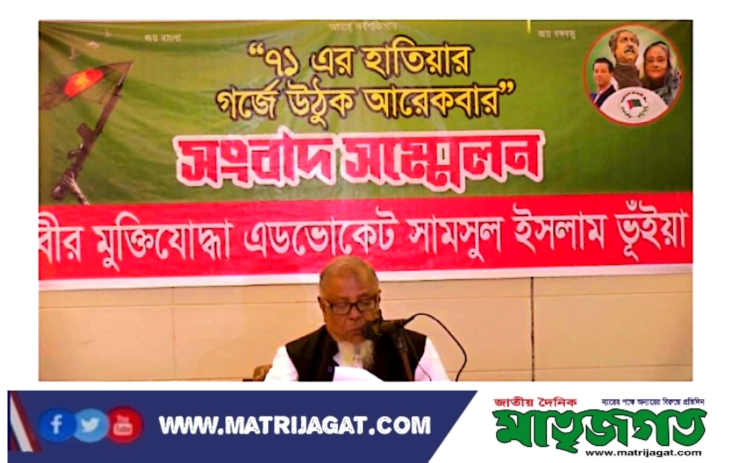 মো:ফয়জুল্লাহ স্বাধীন "৭১এর হাতিয়ার গর্জে উঠুক আরেকবার "ব্যানারে সংবাদ সম্মেলন করেছেন নারায়ণগঞ্জ-৩ আসনের আওয়ামী লীগেরমনোনয়ন প্রত্যাশী বীর মুক্তিযোদ্ধা এডভোকেট সামসুল ইসলাম ভূঁইয়া।