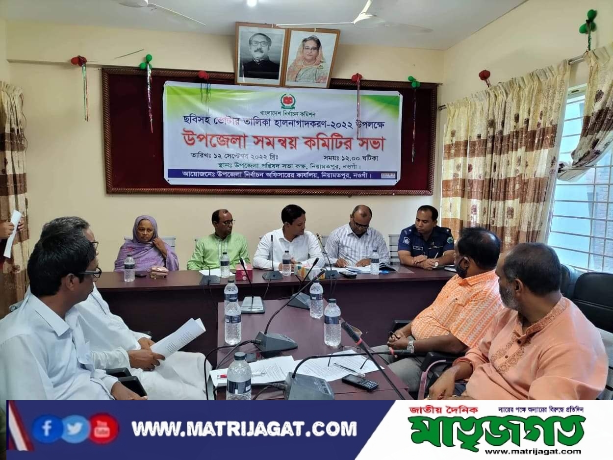 জাকির হোসেন স্টাফ রিপোর্টারঃ নওগাঁর নিয়ামতপুরে ছবিসহ ভোটার তালিকা হালনাগাদকরন ২০২২ উপলক্ষে উপজেলা সমন্বয় কমিটির সভা অনুষ্ঠিত হয়েছে। সোমবার দুপুরে উপজেলা পরিষদ মিলনায়তনে উপজেলা নির্বাচন অফিসারের কার্যালয়ের আয়োজনে এ সভা অনুষ্ঠিত হয়। উপজেলা নির্বাহী কর্মকর্তা (ইউএনও) ফারুক সুফিয়ানের সভাপতিত্বে প্রধান অতিথি হিসেবে উপস্থিত ছিলেন উপজেলা পরিষদ চেয়ারম্যান ফরিদ আহম্মেদ।