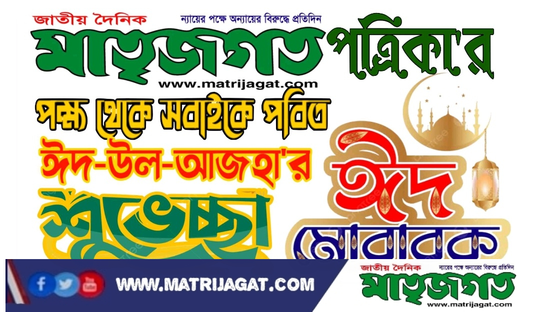 জাতীয় দৈনিক মাতৃজগত পত্রিকা'র সকল পাঠক, লেখক, গ্রাহক, হকার, বিজ্ঞাপনদাতা ও শুভানুধ্যায়ী—সবাইকে ঈদুল আজহার শুভেচ্ছা।