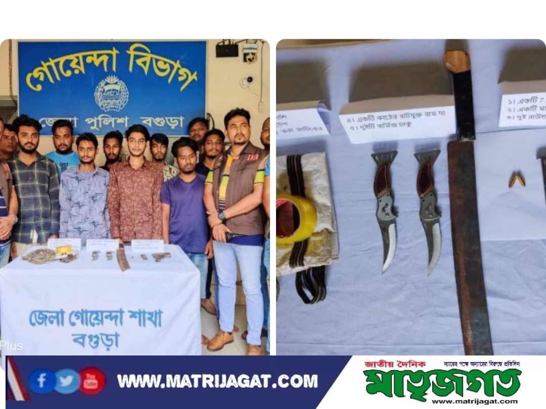 নিজস্ব প্রতিবেদকঃ-বগুড়া জেলার সুযোগ্য পুলিশ সুপার সুদীপ কুমার চক্রবর্ত্তী বিপিএম সেবা মহোদয়ের সার্বিক দিক নির্দেশনায় অতিরিক্ত পুলিশ সুপার (প্রশাসন) আলী হায়দার চৌধুরী বিপিএম এর তত্ত্বাবধানে ডিবি বগুড়া’র অফিসার ইনচার্জ (ওসি) মোঃ সাইহান ওলিউল্লাহ এর নেতৃত্বে বগুড়া ডিবির একটি টিম নিখুঁত গোয়েন্দা তথ্যের ভিত্তিতে বিশেষ অভিযান চালিয়ে ডাকাতির প্রস্তুতিকালে ০২ রাউন্ড গুলি ভর্তি ম্যাগজিনসহ, ০১(এক) টি বিদেশী পিস্তল ও দেশীয় অস্ত্র-সস্ত্রসহ আন্তঃ জেলা ডাকাত দলের ০৮ (আট) সদস্যকে গ্রেফতার করেছে।