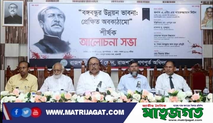১৫ আগস্ট জাতীয় শোক দিবস উপলক্ষে রাজশাহী গণপূর্ত জোনের আয়োজনে ‘বঙ্গবন্ধুর উন্নয়ন ভাবনা: প্রেক্ষিত অবকাঠামো’ শীর্ষক আলোচনা সভা অনুষ্ঠিত হয়েছে। বৃহস্পতিবার দুপুরে গণপূর্ত সম্মেলন কক্ষে আয়োজিত আলোচনা সভায় প্রধান অতিথি হিসেবে উপস্থিত ছিলেন বাংলাদেশ আওয়ামী লীগের সভাপতিমণ্ডলীর সদস্য ও রাজশাহী সিটি কর্পোরেশনের মেয়র এ.এইচ.এম খায়রুজ্জামান লিটন। সভার শুরুতে জাতির পিতা বঙ্গবন্ধু শেখ মুজিবুর রহমান ও ১৫ আগস্টের শহীদগণ ও জাতীয় চারনেতার স্মরণে এক মিনিট নিরবতা পালন করা হয়। শেষে দোয়া ও মোনাজাত করা হয়।