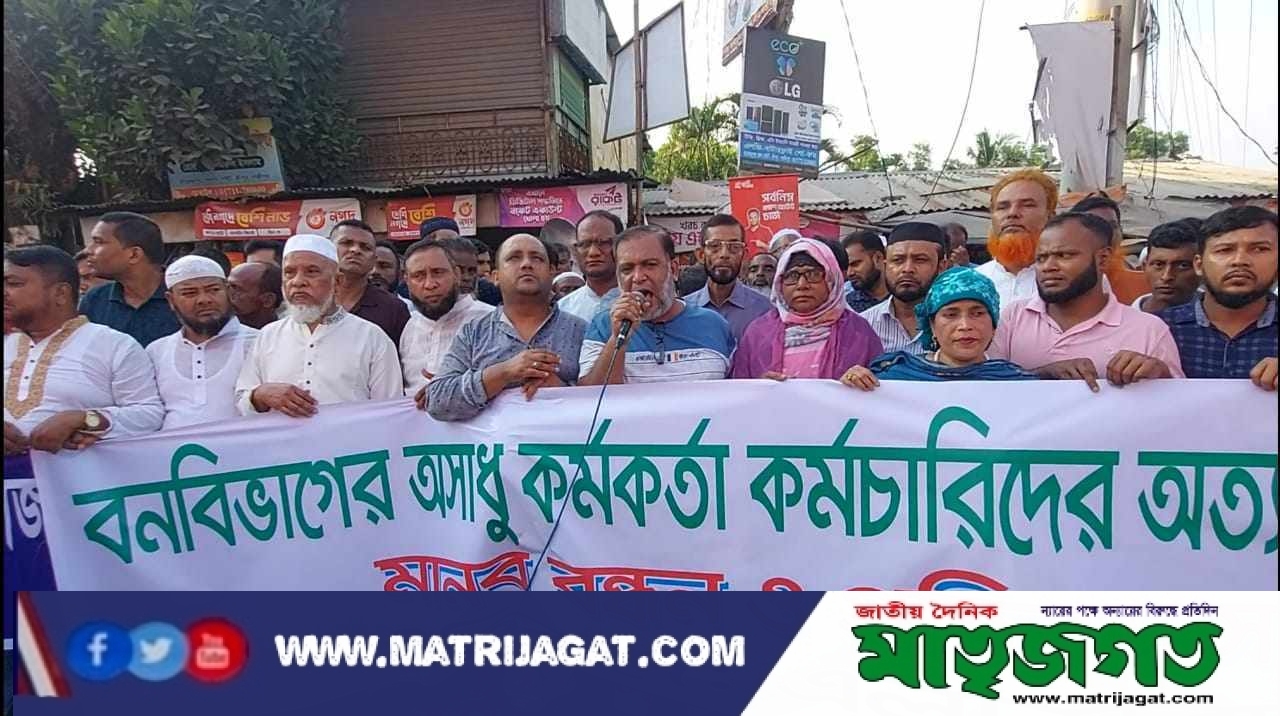 বন বিভাগের হয়রানি থেকে রক্ষা পেতে রাস্তায় মানববন্ধন করেছে এলাকাবাসী