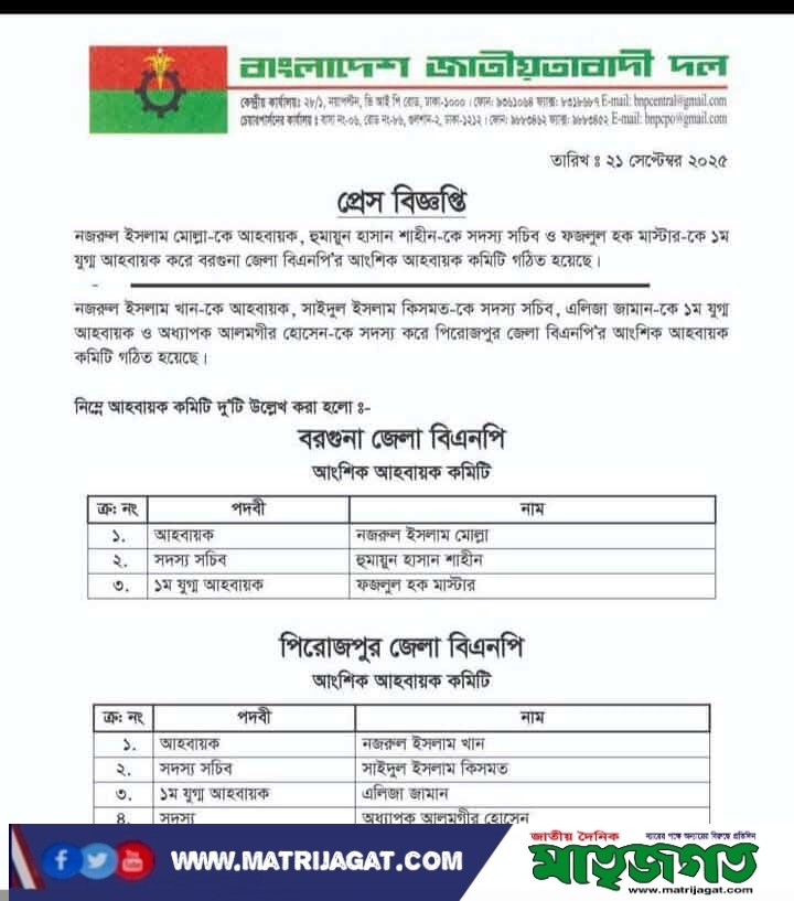 বাংলাদেশ জাতীয়তাবাদী দল (বিএনপি) বরগুনা জেলা শাখার আংশিক আহ্বায়ক কমিটি ঘোষণা করা হয়েছে। নতুন ঘোষিত কমিটিতে জেলা বিএনপির অভিজ্ঞ ও জনপ্রিয় নেতা নজরুল ইসলাম মোল্লাকে আহ্বায়ক, তরুণ ও উদ্যমী নেতা হুমায়ুন হাসান শাহীনকে সদস্য সচিব এবং প্রবীণ শিক্ষক নেতা ফজলুল হক মাস্টারকে প্রথম যুগ্ম আহ্বায়ক করা হয়েছে।