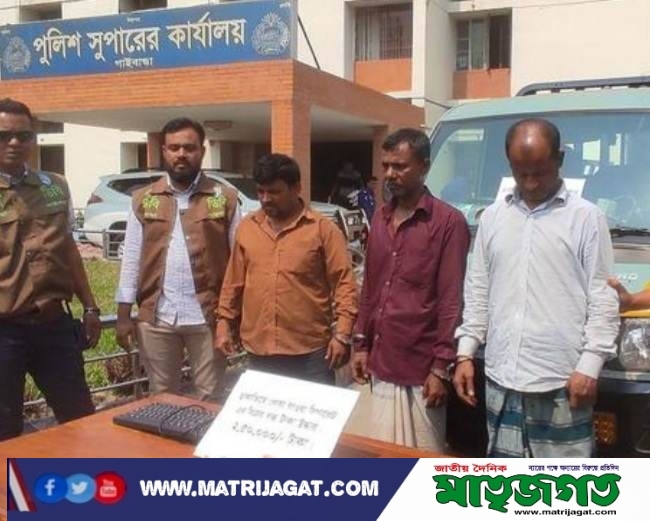 সংঘবদ্ধ চক্রের মূলহোতা নাছির উদ্দিন মোল্লা দেলোয়ারসহ (৫০) তিনজনকে গ্রেপ্তার করেছে গাইবান্ধা গোয়েন্দা পুলিশ (ডিবি)।বাংলাদেশের বিভিন্ন জেলায় সিগারেটের গোডাউনে ডাকাতির সংঘবদ্ধ চক্রের মূলহোতা নাছির উদ্দিন মোল্লা দেলোয়ারসহ (৫০) তিনজনকে গ্রেপ্তার করেছে গাইবান্ধা গোয়েন্দা পুলিশ (ডিবি)। গ্রেপ্তার নাছির বরগুনা জেলার আশকোনা থানার মৃত চান মিয়ার ছেলে। অপর দুজন হলেন, গাজীপুর জেলার কাশিমপুর উপজেলার সারদাগঞ্জ গ্রামের মৃত ছমির উদ্দিনের ছেলে হাফিজুর রহমান (৪৫) ও ঝিনাইদহ জেলার কোটচাঁদপুর থানা এলাকার এলাঙ্গী গ্রামের আব্দুল হামিদের ছেলে জাহিদুল ইসলাম(৩৬)। শনিবার বেলা ১২টায় সংবাদ সম্মেলন করে বিষয়টি জানান গাইবান্ধার পুলিশ সুপার (এসপি) কামাল হোসেন। এর আগে টানা তিনদিন ঢাকা ও গাজীপুরের বিভিন্ন এলাকায় ঝটিকা অভিযান চালিয়ে শুক্রবার তাদের গ্রেপ্তার করা হয়। সংবাদ সম্মেলনে এসপি জানান, গত বছরের ২৯ নভেম্বর গভীর রাতে গাইবান্ধা জেলার পলাশবাড়ী থানার পৌরসভাস্থ নুনিয়াগাড়ীর মেসার্স উচ্ছ্বাস তরঙ্গ ট্রেডার্স ডাকাতির ঘটনা ঘটে। এদিন ওই ট্রেডার্স থেকে নগদ ৩ লাখ ৮ হাজার ৯৬ টাকা, একটি ৫০ হাজার টাকা মূল্যের কম্পিউটারের সিপিইউ, ২০ হাজার টাকা মূল্যের একটি প্রিন্টার, নাইট গার্ডের ব্যবহৃত দুটি মোবাইল ফোন ও ১০ লাখ ২৪ হাজার ৬৬২ টাকা মূল্যের ২৫ কার্টন সিগারেট ডাকাতির ঘটনা ঘটে। এছাড়া চলতি বছরের ২২ জানুয়ারি গভীর রাতে গাইবান্ধা পৌর এলাকার মাস্টারপাড়ার মেসার্স সবুর এন্ড ব্রাদার্স প্রতিষ্ঠান থেকে পাঁচ লাখ ১০ হাজার টাকার সিগারেট চুরি হয়। এসব ঘটনায় পলাশবাড়ি ও সদর থানায় দুটি মামলা হয়। পরে ঘটনাগুলোর সূত্র ধরে গাইবান্ধা ডিবির উপপরিদর্শক (এসআই) বদরুজ্জামান মোল্লার নেতৃত্বে একটি টিম টানা তিনদিন ঝটিকা অভিযান চালিয়ে ঢাকা ও গাজীপুর থেকে তিনজনকে গ্রেপ্তার করে। এ সময় ডাকাতদের কাছ থেকে ডাকাতির কাজে ব্যবহৃত একটি পিকআপ ও নগদ ২ লাখ ৫০ হাজার টাকাসহ একটি কম্পিউটার কি-বোর্ড উদ্ধার করা হয়। এসপি বলেন, ‘ডাকাতদের সংঘবদ্ধ একটি বড় চক্র রয়েছে। তারা বিভিন্ন সময়ে দেশের বিভিন্ন জেলায় এই ধরনের ডাকাতি করে থাকে। তাদের প্রত্যেকের নামে দেশের বিভিন্ন থানা এলাকায় ৭-৮ টি করে মামলা রয়েছে। যা আদালতে বিচারাধীন।’