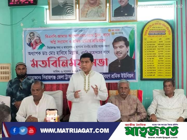 বিএনপি- জামায়াতের নৈরাজ্যে, অগ্নিসংযোগ ও পরিবহন শ্রমিক হত্যার প্রতিবাদে সিরাজগঞ্জে মতবিনিময় সভা অনুষ্ঠিত হয়েছে।