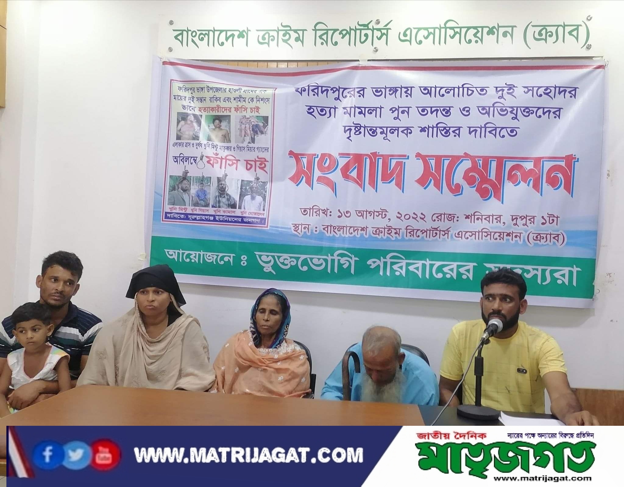নিজস্ব প্রতিবেদকঃ ফরিদপুরের ভাঙ্গায় আলোচিত দুই ভাই হত্যাম মামলা পুন:তদন্ত ও ঘটনায় জড়িতদের দৃষ্টান্তমূলক শাস্তি দাবি জানিয়েছে নিহগতের পরিবার। শনিবার (১৩ আগস্ট) দুপুরে বাংলাদেশ ক্রাইম রিপোর্টার্স এসোসিয়েশন (ক্র্যাব) মিলনায়তনে আযোজিত সংবাদ সম্মেলনে এ দাবি জানানো হয়।