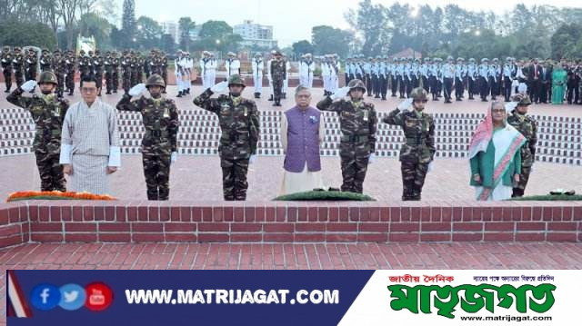 প্রথমে রাষ্ট্রপতি ও ভুটানের রাজা এবং পরে প্রধানমন্ত্রী বাঙা জাতীয় বীর সন্তানদের প্রতি শ্রদ্ধা জানান। এ সময় তারা কিছুক্ষণ নীরবে দাঁড়িয়ে থাকেন। সেনা, নৌ ও বিমানবাহিনীর একটি চৌকস দল রাষ্ট্রীয় সালাম জানায়। এ সময় বিউগলে করুণ সুর বেজে ওঠে।