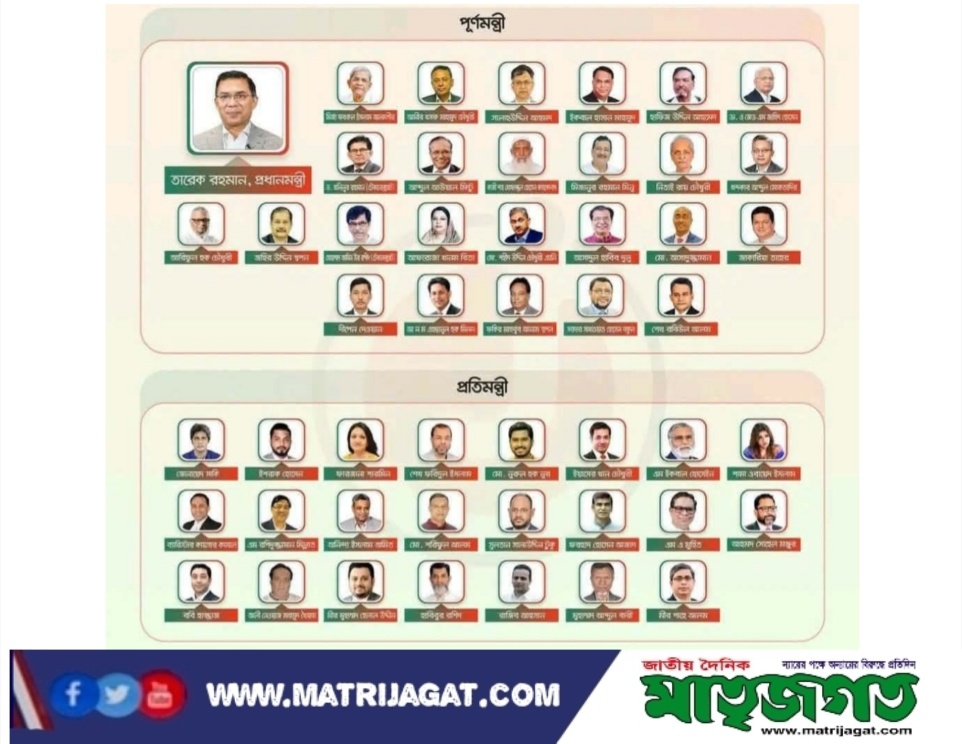 প্রধানমন্ত্রী তারেক রহমান তার মন্ত্রিপরিষদে ২৫ জন পূর্ণমন্ত্রী রেখেছেন। এর মধ্যে ২৩ জন নির্বাচিত সংসদ সদস্য এবং ২ জন টেকনোক্র্যাট মন্ত্রী।