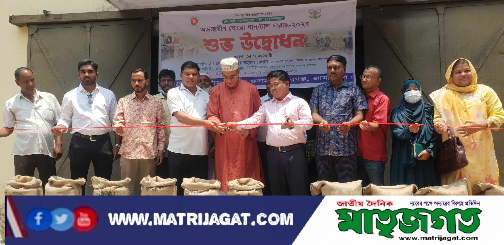 শেখ হাসিনার বাংলাদেশ ক্ষুধা হবে নিরুদ্দেশ এ স্লোগানে জামালপুরের মাদারগঞ্জে অভ্যন্তরীণ বোরো ধান-চাল সংগ্রহ-২০২৩ খ্রীঃ শুভ উদ্বোধন করা হয়েছে। সোমবার বেলা পৌনে ১২ টায় খাদ্য গুদামে বোরো ধান-চাল সংগ্রহ শুভ উদ্বোধন করা হয়। এতে প্রধান অতিথি হিসেবে উপস্থিত থেকে শুভ উদ্বোধন করেন উপজেলা পরিষদের চেয়ারম্যান ওবায়দুর রহমান বেলাল। বিশেষ অতিথি মাদারগঞ্জ পৌরসভার মেয়র মির্জা গোলাম কিবরিয়া কবির। সভাপতিত্ব করেন উপজেলা নির্বাহি কর্মকর্তা ইলিশায় রিছিল। এ সময় কৃষি সম্প্রসারণ কর্মকর্তা রওশন আরা আক্তার, বালিজুড়ী খাদ্য গুদামের ভারপ্রাপ্ত কর্মকর্তা শামীমা নাসরিন, মাদারগঞ্জ প্রেসক্লাবের সভাপতি জাহিদুর রহমান উজ্জল, মাদারগঞ্জ উপজেলা প্রেসক্লাবের সভাপতি মোহাম্মদ আলী জিন্নাহ, মাদারগঞ্জ চালকল মালিক সমিতির সভাপতি আঃ ওয়াদুদ ও সাধারণ সম্পাদক সেলিম আহম্মেদ, মুক্তি রাইস মিল এর স্বত্তাধিকারী মিজানুর রহমান মুক্তিসহ খাদ্য গুদামের কর্মচারীবৃন্দ উপস্থিত ছিলেন। উল্লেখ্য যে, রেজিস্ট্রেশনের মাধ্যমে ধান ক্রয় সংগ্রহ চলছে। একজন কৃষক রেজিস্ট্রেশনের মাধ্যমে ৩ টন ধান গুদামে বিতরণ করতে পারবে। ধান ৩০ টাকা কেজি দরে ১২শ টাকা মন নির্ধারণ করেছে সরকার। চাল ৪৪ টাকা কেজি দরে ১৭৬০ টাকা মন। মাদারগঞ্জ উপজেলা থেকে ১৩২৮ মেট্রিক টন ধান ও ৮৬৬ মেট্রিক টন চাল ক্রয় করবে বলে বালিজুড়ী খাদ্য গুদাম অফিস সূত্রে জানা গেছে।