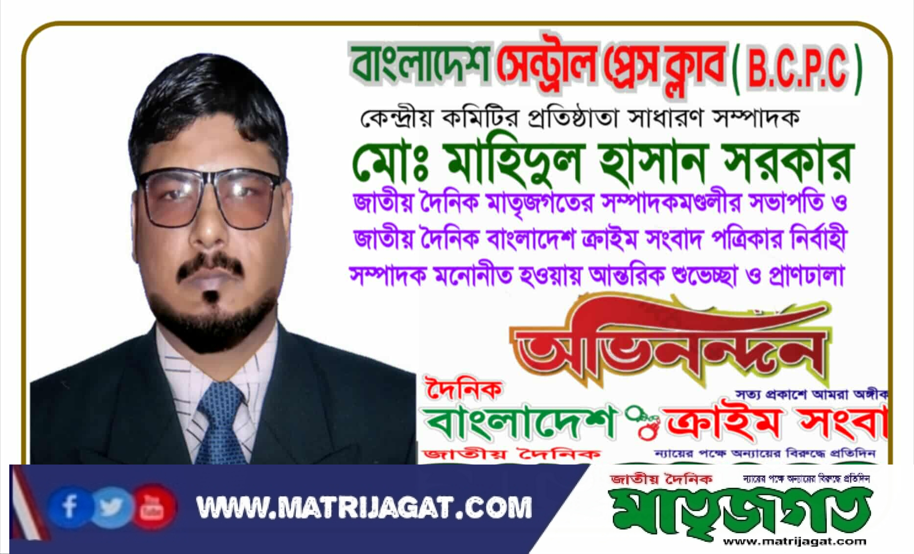 বাংলাদেশ সেন্ট্রাল প্রেস ক্লাব (বি.সি.পি.সি)-এর প্রতিষ্ঠাতা সাধারণ সম্পাদক, সাহসী তরুণ সাংবাদিক মোঃ মাহিদুল হাসান সরকারকে জাতীয় দৈনিক মাতৃজগত পত্রিকার সম্পাদকমণ্ডলীর সভাপতি এবং জাতীয় দৈনিক বাংলাদেশ ক্রাইম সংবাদ পত্রিকার নির্বাহী সম্পাদক হিসেবে মনোনীত করা হয়েছে।