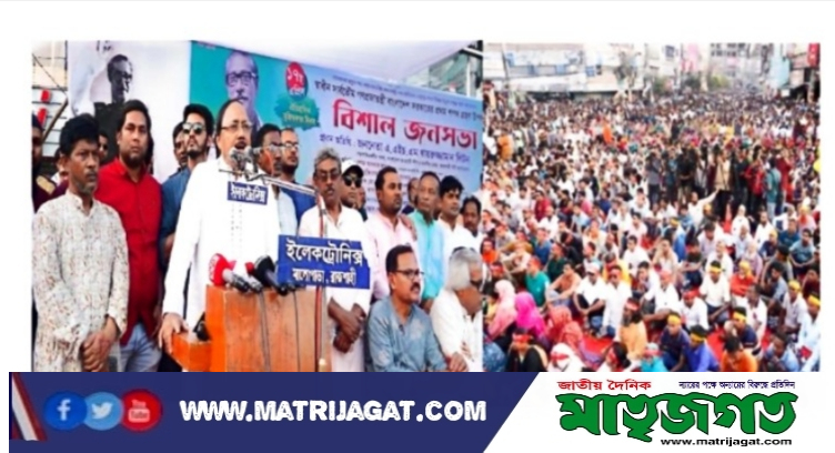 রাজশাহী মহানগর আওয়ামী লীগের সভাপতি বীর মুক্তিযোদ্ধা মোহাম্মদ আলী কামালের সভাপতিত্বে বিশাল জনসভায় বিশেষ অতিথির বক্তব্য দেন কেন্দ্রীয় আওয়ামী লীগের সদস্য বেগম আখতার জাহান, রাজশাহী জেলা আওয়ামী লীগের সভাপতি বীর মুক্তিযোদ্ধা অনিল কুমার সরকার, রাজশাহী-২ (সদর) আসনের সংসদ সদস্য অধ্যক্ষ শফিকুর রহমান বাদশা, রাজশাহী-৩ (পবা-মোহনপুর) আসনের সংসদ সদস্য মুহা. আসাদুজ্জামান আসাদ। জনসভা সঞ্চালনা করেন রাজশাহী মহানগর আওয়ামী লীগের যুগ্ম সাধারণ সম্পাদক মোস্তাক হোসেন ও জেলা আওয়ামী লীগের যুগ্ম সাধারণ সম্পাদক এ্যাড. লায়েব উদ্দিন লাভলু।