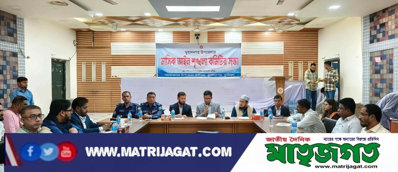 কুমিল্লার মুরাদনগরে মাসিক আইন-শৃঙ্খলা ও সমন্বয় সভা অনুষ্ঠিত হয়েছে। বৃহস্পতিবার সকাল সাড়ে ১১টায় উপজেলা কবি নজরুল মিলনায়তনে অনুষ্ঠিত এ সভায় উপজেলার সার্বিক নিরাপত্তা পরিস্থিতি, উন্নয়ন কার্যক্রম, মাদক নিয়ন্ত্রণ ও সামাজিক বিরোধ নিরসনসহ গুরুত্বপূর্ণ বিষয়ে আলোচনা হয়।