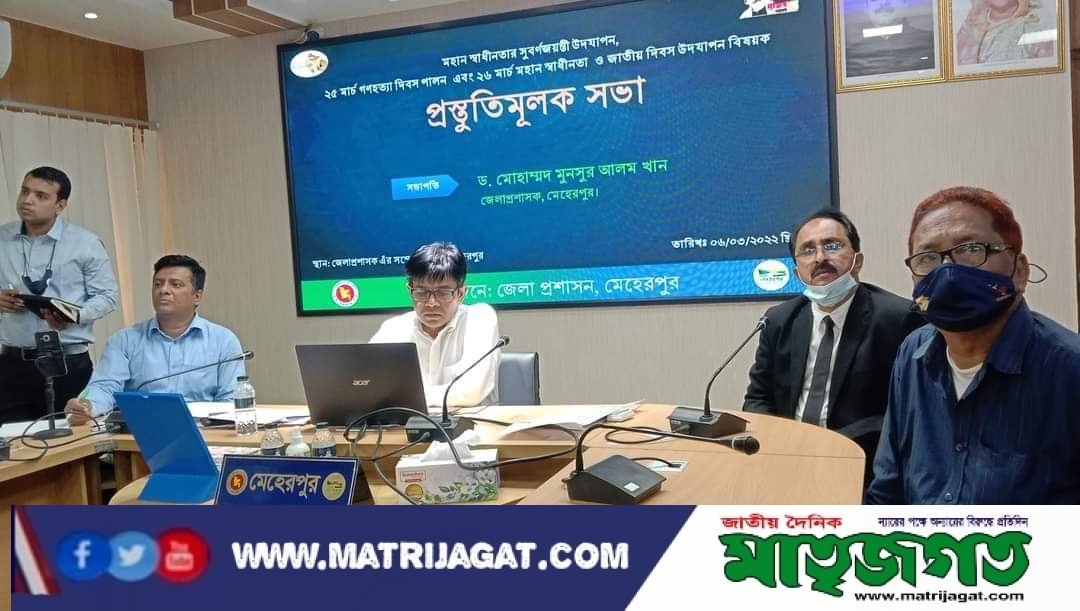 রবিবার সকালে জেলা প্রশাসকের কার্যালয় ২৫মার্চ গণহত্যা দিবস ও২৬ শে মার্চ মহান স্বাধীনতা ও জাতীয় দিবস উপলক্ষে প্রস্তুতি সভা অনুষ্ঠিত হয়। জেলা প্রশাসক ডক্টর মোঃ মুনসুর আলম খানের সভাপতিত্বে প্রস্তুতিমূলক সভা অনুষ্ঠিত হয় এ সময় উপস্থিত ছিলেন জেলা আওয়ামী লীগের যুগ্ন সাংগঠনিক সম্পাদক অ্যাডভোকেট ইব্রাহিম শাহীন অতিরিক্ত জেলা প্রশাসক সার্বিক মৃধা মোঃ মোজাহিদুল ইসলাম আরো উপস্থিত ছিলেন জেলা শিল্পকলা একাডেমীর সাধারণ সম্পাদক মোঃ সাইদুর রহমান ও জেলা শিল্পকলা একাডেমির সহ-সভাপতি নুরুল আহমদ, বিটিভির সংগীতশিল্পী আশরাফ মাহমুদ এছাড়াও ভার্চুয়াল অনলাইনে উপস্থিত ছিলেন জেলা আওয়ামী লীগের সাধারণ সম্পাদক এম এ খালেক, মেহেরপুর জেলা পরিষদের চেয়ারম্যান আলহাজ্ব গোলাম রসূল, এছাড়াও ভার্চুয়াল অনলাইনে উপস্থিত ছিলেন মেহেরপুর জেলা সরকারি ও বেসরকারি কর্মকর্তা কর্মচারীবৃন্দ উপস্থিত ছিলেন।