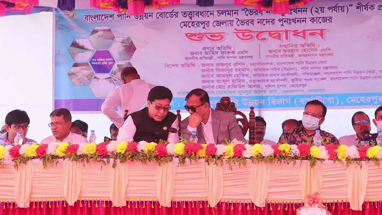 তুহিন ইসলাম মেহেরপুরঃ আজ সকাল ১১.০০ সময় মেহেরপুরে দ্বিতীয় পর্যায়ে খাল খননের শুভ উদ্বোধন হয়েছে। এই সময় পানি সম্পদ প্রতিমন্ত্রী বলেন, আমাদের বাংলাদেশে পানির সমস্যা দেখা দিয়েছে। পানির স্তর নিচে নেমে যাচ্ছে। তার পরেও আমরা ডেল্টা প্লানের মাধ্যমে ৬৪ জেলায় খাল খননের আওয়াতায় আনা হয়েছে। ৫১৭টি ছোট নদী ও খাল খনন করা হচ্ছে। এর ফলে পানির স্তর উপরে উঠে আসছে। প্রথম পর্যায়ের কাজ ডিসেম্বরে শেষ হবে। দ্বিতীয় পর্যায়ে আরো ৩ হাজার ছোট নদী ও খাল খনন করা হবে যেটি বাস্তবায়ন হলে নদীর নব্যতা ফিরে আসবে বলে মন্তব্য করেন পানি সম্পদ প্রতিমন্ত্রী জাহিদ ফারুক। তিনি আরো বলেন নদীর পাড়ের অবৈধ স্থাপনা গুলো উচ্ছেদ করা হবে। এছাড়া নদীর সীমানা নির্ধারন অনেক সময় সাপেক্ষ ব্যাপার বলেও জানান পানি সম্পদ প্রতিমন্ত্রী জাহিদ ফারুক। বৃহস্পতিবার সকাল সাড়ে ১১ টার দিকে মুজিবনগর উপজেলার যতারপুর সরকারি প্রাথমিক বিদ্যালয় মাঠে ২য় পর্যায়ে ভৈরব নদী খননের উদ্বোধন অনুষ্ঠানে তিনি এসব কথা বলেন। এর আগে সকাল ১০.৩০টার সময় হেলিকপ্টর যোগে তিনি মুজিবনগরে অবতরন করেন। সেখানে শহীদ স্মৃতি সৌধে শহীদদের প্রতি শ্রদ্ধা নিবেদন করেন তিনি। পরে যতারপুর সরকারি প্রাথমিক বিদ্যালয় মাঠে ২য় পর্যায়ে ভৈরব নদী খননের ফলক উন্মোচন করে অনুষ্ঠানের উদ্বোধন করেন। এ সময় সেখানে উপস্থিত ছিলেন মেহেরপুর জেলা আওয়ামীলীগের সভাপতি ও জনপ্রশাসন প্রতিমন্ত্রী ফরহাদ হোসেন, পানি উন্নয়ন বোর্ডের মহা-পরিচালক ফজলুল রশিদ, জেলা প্রশাসক ড. মনসুর আলম খান, পুলিশ সুপার রাফিউল আলম সহ বিভিন্ন স্তরের কর্মকর্তাবৃন্দ ও এলাকাবাসী।