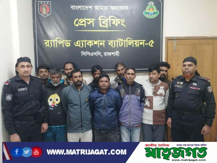 মোঃ সুজন আহাম্মেদ স্টাফ রিপোর্টারঃ র্যাব-৫, রাজশাহীর একটি অপারেশন দল ১৩ ফেব্রুয়ারি ২০২৪ তারিখ সময় রাত্রী-২২.৩০ ঘটিকায় রাজশাহী মহানগরীর মতিহার থানাধীন চরশ্যামপুর নামক এলাকায় অপারেশন পরিচালনা করে ট্যাপেন্টাডল ট্যাবলেট-৬৪ পিচ, গাঁজা-৫০ গ্রাম, মোবাইল-০৭টি, সীম-১২টি, কলকি-০৩টি, কাটার-০২টি, কাঠের টুকরা-০২টি, গ্যাসলাইট-০২ টি উদ্ধার করেন এবং মাদক ব্যবসায়ী আসামী ১। মোঃ হাসান আলী (৪৩), পিতা-মৃত সাদেক আলী, সাং-ডাঁসমারী, ২। মোঃ নান্নু (২৪), পিতা-মোঃ মন্টু, ৩। মোঃ মিলন আলী (৩৫), পিতা-মৃত আবেদ আলী, ৪। শ্রী কমল (৩৫), পিতা-মৃত শ্যামল দাস, সর্ব সাং-চরশ্যামপুর, থানা-মতিহার, রাজশাহী মহানগর এবং মাদক সেবনকারী আসামী ৫। মোঃ মিনারুল ইসলাম (৩০), পিতা-মোঃ নাজিম উদ্দিন, ৬। মোঃ বাবু (২১), পিতা-মোঃ হাবিব, ৭। মোঃ আসিফ আলী (২০), পিতা-মোঃ মাইনুল আলী, ৮। মোঃ ইউসূফ আলী (৪১), পিতা-মৃত হাসিল, ৯। মোঃ ইসলাম (৪২), পিতা-মৃত নওশাদ আলী, ১০। মোঃ জালাল উদ্দিন (৫০), পিতা-মৃত হেদায়েতুল্লাহ শেখ, সর্ব সাং-চরশ্যামপুর, থানা-মতিহার, রাজশাহী মহানগরদের’কে গ্রেফতার করে।