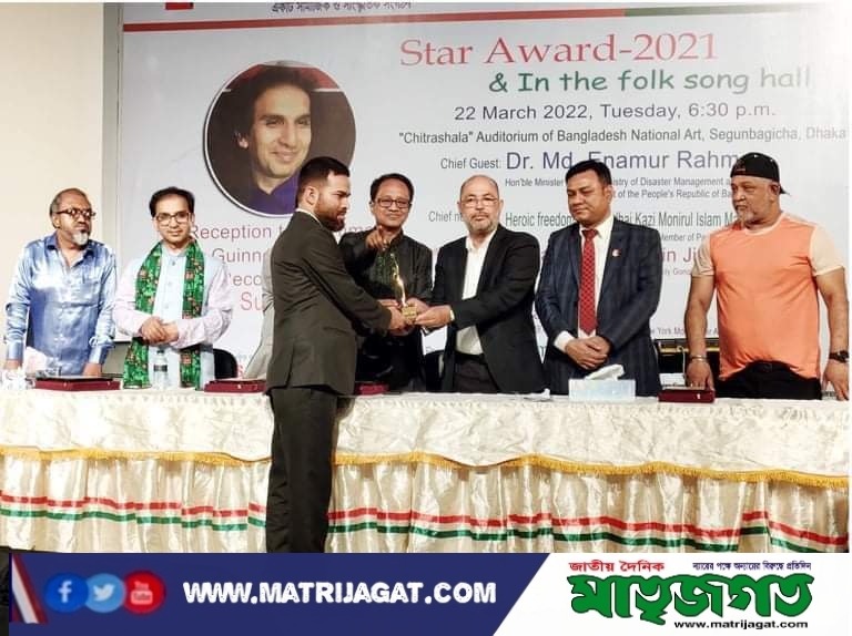 রায়গঞ্জ প্রতিনিধিঃ স্বাধীনতার ৫০ বছর পূর্তিতে বাংলার সঙ্গীত (একটি সামাজিক ও সাংস্কৃতিক সংগঠন) কর্তৃক আয়োজিত বাংলার সঙ্গীত ‘ষ্টার এওয়ার্ড-২০২২’ তারকাদের মিলনমেলা ও গুণীজন সংবর্ধণায় ‘সাংবাদিক ও সংগঠক’’ এর ষ্টার এওয়ার্ড পেলেন- রায়গঞ্জ উপজেলার ধানগড়া ইউনিয়নের লাহোর গ্রামের মৃত ইসহাক খানের কৃতি সন্তান- ইনডেস্ক নিউজ বিডি এর উপদেষ্টা মোঃ মাহবুবুল আলম খান (মুরাদ)। তার এই এওয়ার্ড অর্জণ করায় রায়গঞ্জবাসী তাকে সাধুবাদ জানিয়েছেন। ২২ মার্চ ২০২২, মঙ্গলবার, সন্ধ্যা ০৬.৩০ মিনিটে বাংলাদেশ জাতীয় শিল্পকলার æচিত্রশালা” মিলনায়তন, সেগুন বাগিচা, ঢাকায় মোঃ ফরমান আলী, বীর মুক্তিযোদ্ধা ও সাবেক সিনিয়র জেল সুপার এর সভাপতিত্বে স্বাধীনতার ৫০ বছর পূর্তিতে লিপু খন্দকার পরিচালিত বাংলার সঙ্গীত (একটি সামাজিক ও সাংস্কৃতিক সংগঠন) কর্তৃক আয়োজিত বাংলার সঙ্গীত ‘ষ্টার এওয়ার্ড-২০২২’ তারকাদের মিলনমেলা ও গুণীজন সংবর্ধণা অনুষ্ঠিত হয়।উক্ত মিলনমেলা ও গুণীজন সংবর্ধণা অনুষ্ঠানে প্রধান অতিথির আসন অলংকিত করেন- গণপ্রজাতন্ত্রী বাংলাদেশ সরকারের দুর্যোগ ব্যবস্থাপনা ও ত্রাণ মন্ত্রণালয়ের প্রতিমন্ত্রী- ডাঃ মোঃ এনামুর রহমান, সংসদ সদস্য, ঢাকা-১৯, ও প্রতিষ্ঠাতা চেয়ারম্যান, এনাম মেডিকেল কলেজ ও হাসপাতাল। এছাড়া প্রধান আলোচক হিসেবে উপস্থিত ছিলেন- বীর মুক্তিযোদ্ধা আলহাজ্ব কাজী মনিরুল ইসলাম মনু, বি.এ, সংসদ সদস্য, ঢাকা-০৫, উদ্বোধক হিসেবে উপস্থিত ছিলেন- মোহাম্মদ নিজাম উদ্দিন জিতু, চেয়ারম্যান, টেলিলিংক গ্রুপ, সম্পাদক ও প্রকাশক, দৈনিক গণকণ্ঠ, বিশেষ অতিথি হিসেবে উপস্থিত ছিলেন- রমজান আলী, মেয়র মানিকগঞ্জ, জাকারিয়া চৌধুরী, চেয়ারম্যান, এনআরবি অ্যাসোসিয়েশন ইউএসএ এবং চেয়ারম্যান নিউইয়র্ক মহানগর আওয়ামী লীগ, ডন, খল নায়কসহ ব্যক্তিত্ব প্রমুখ। উক্ত মিলনমেলা ও গুণীজন সংবর্ধণা অনুষ্ঠানে দীর্ঘতম তবলা ম্যারাথন পাঁচবার গিনেস ওয়ার্ল্ড রেকর্ডধারী- ব্যারিষ্টার পন্ডিত সুদার্শন দাসকে বিশেষ সম্মানে ভূষিত করা হয়। তারকাদের মিলনমেলা ও গুণীজন সংবর্ধণা অনুষ্ঠানে গণপ্রজাতন্ত্রী বাংলাদেশ সরকারের দুর্যোগ ব্যবস্থাপনা ও ত্রাণ মন্ত্রণালয়ের প্রতিমন্ত্রী- ডাঃ মোঃ এনামুর রহমান, সংসদ সদস্য ঢাকা-১৯, ইনডেস্ক নিউজ বিডি এর উপদেষ্টা- মোঃ মাহবুবুল আলম খান (মুরাদ)সহ বিভিন্ন গুনীজনদের এওয়ার্ড প্রদান করে সম্মাননা করেন। এওয়ার্ড প্রদান শেষে দেশের সুনাম ধন্য শিল্পীদের মনোজ্ঞ সাংস্কৃতিক অনুষ্ঠান অনুষ্ঠিত হয়।
