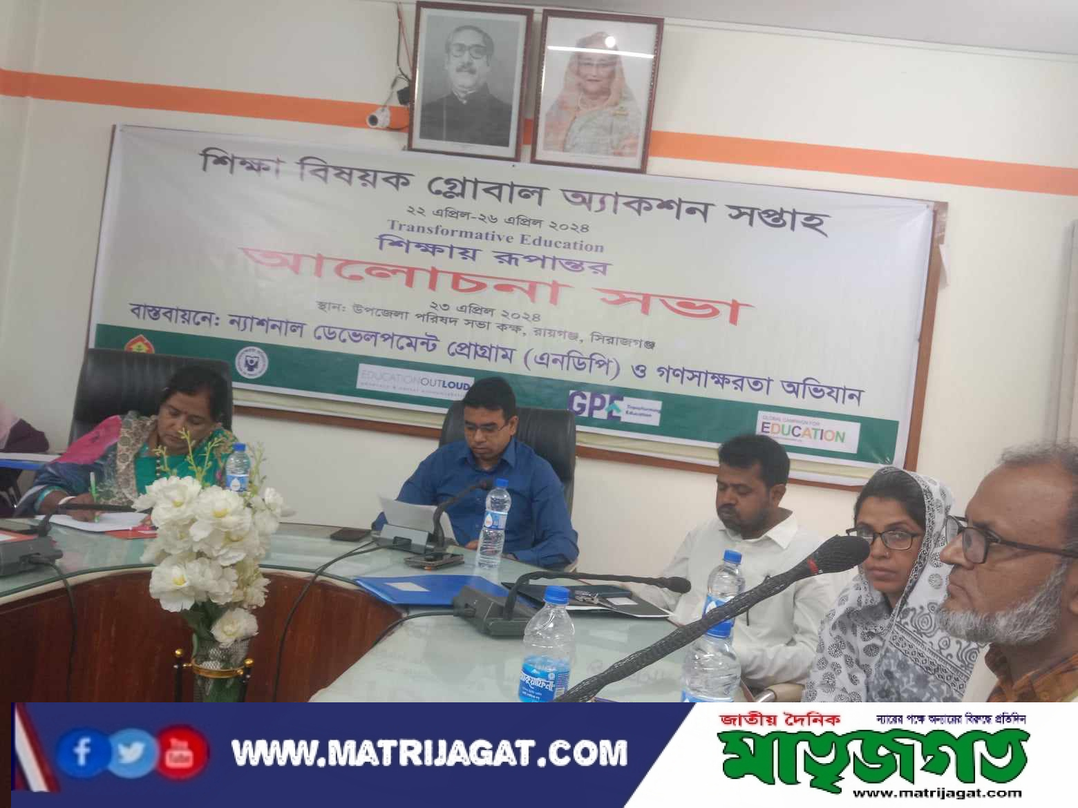 অনুষ্ঠান উপস্থাপনা করেন শিপন কুমার নাগ উপ ব্যবস্থাপক এনডিপি সিরাজগঞ্জ। অনুষ্ঠান বাস্তবায়নে ন্যাশনাল ডেভেলপমেন্ট প্রোগ্রাম ( এনডিপি) ও গণসাক্ষরতা অভিযান। সভায় বক্তারা বলেন মান সম্মত শিক্ষা নিশ্চিত করতে সরকারি বেসরকারি প্রতিষ্ঠানের পাশাপাশি বিত্তবান ব্যক্তিদের ও এগিয়ে আসতে হবে।