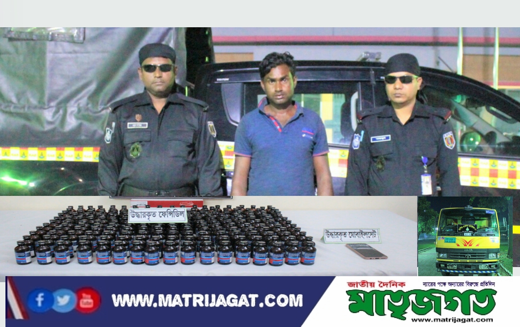 শুক্রবার (৪ নভেম্বর) বিকেল ০৪:৫৫ ঘটিকার সময় গোপন সাংবাদের ভিত্তিতে র্যাব-১২ এর সদর কোম্পানীর একটি চৌকষ আভিযানিক দল সিরাজগঞ্জ জেলার বঙ্গবন্ধু সেতু পশ্চিম থানাধীন হাইওয়ে রাস্তার গোলচত্বরের উত্তর পার্শ্বে বঙ্গবন্ধু সেতু পশ্চিম ফুড কর্ণারের সামনে একটি ট্রাকে তল্লাশী চালিয়ে ১৯৯ বোতল ফেন্সিডিলসহ ০১ জন শীর্ষ মাদক ব্যবসায়ীকে গ্রেফতার করেছে। এ সময় একটি ট্রাক এবং একটি মোবাইল জব্দ করেছে।