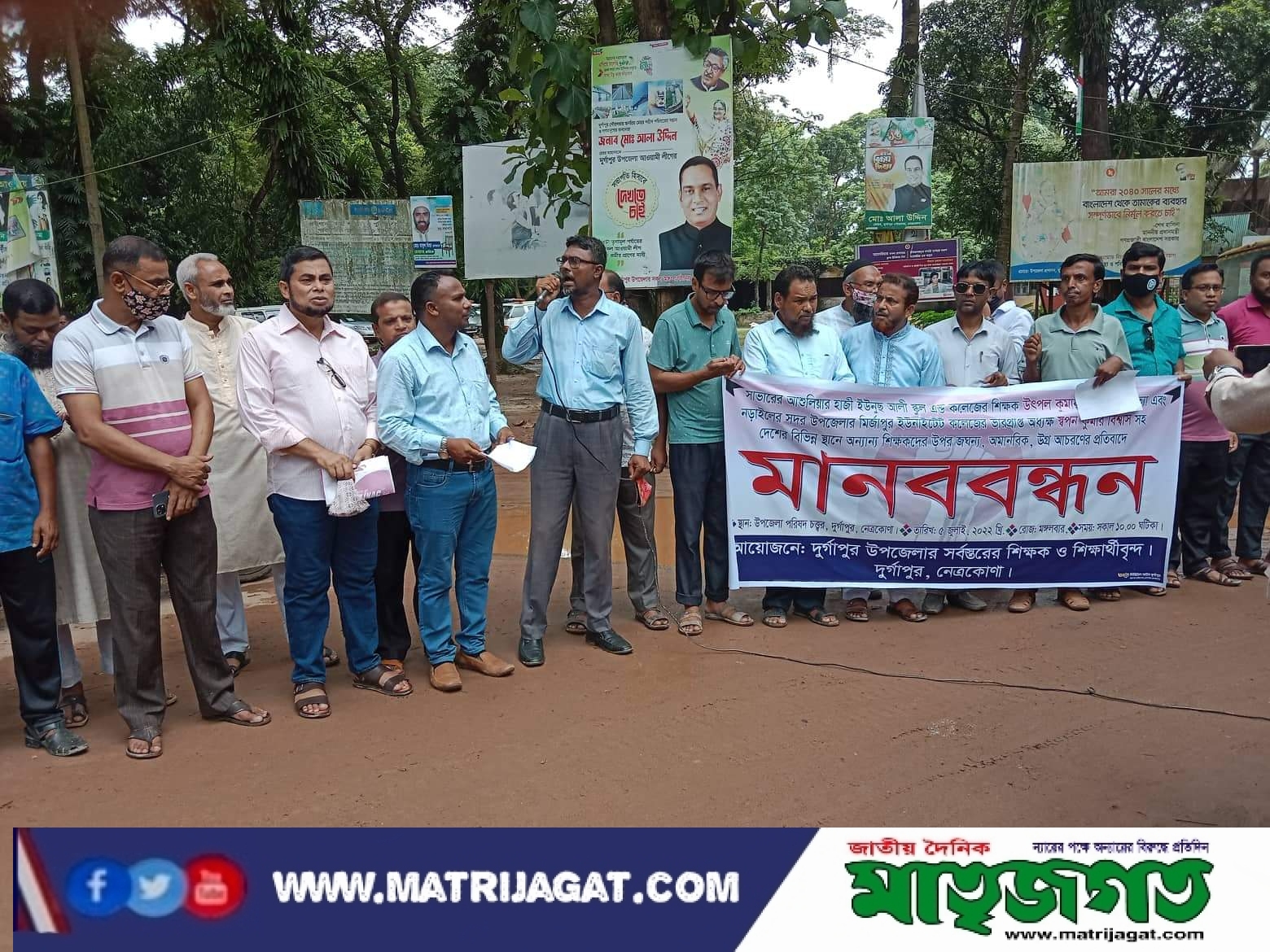 শিক্ষক হত্যা ও শিক্ষক নির্যাতনের প্রতিবাদে সারাদেশের ন্যায় নেত্রকোনার দুর্গাপুরে প্রাথমিক, মাধ্যমিক, মাদ্রাসা ও কলেজ পর্যায়ের শিক্ষকদের উদ্যোগে এক মানব বন্ধন হয়।আজ ৫ জুলাই,মঙ্গলবার,উপজেলা প্রাঙ্গনে সকাল ১০ টায় শুরু হয়ে ঘন্টাব্যাপী চলে এই মানব বন্ধন। উপজেলার এন ভাউরতলা উচ্চ বিদ্যালয়ের সহকারী প্রধান শিক্ষক আজিজুর রহমান খাঁন এর সঞ্চালনায় বাংলাদেশ শিক্ষক সমিতি দুর্গাপুর শাখার সভাপতি প্রধান শিক্ষক হাবিবুর রহমানের সভাপতিত্বে শিক্ষকদের সাথে একাত্মতা প্রকাশ করে বক্তব্য রাখেন প্রাথমিক শিক্ষক সমিতির কেন্দ্রীয় নেতা এমদাদুল হক,বাংলাদেশ শিক্ষক সমিতি দুর্গাপুর শাখার সাধারণ সম্পাদক প্রধান শিক্ষক আতাউর রহমান চন্নু, এ কে এম ইয়াহিয়া, অধক্ষ্য আব্দুর রহমান,অধক্ষ্য ফারুক তালুকদার, আলতাবুর রহমান কাজল,দুলাল চক্রবর্তী, শামছুল হক,আমেনা খাতুন,আবু সাঈদ,শামছুল আলম খান,মোস্তফা কামাল লিটন,প্রভাষক আবু সাদেক,রফিকুল ইসলাম,আব্দুলাহ আল মামুন, ফজলুল হক প্রমুখ।