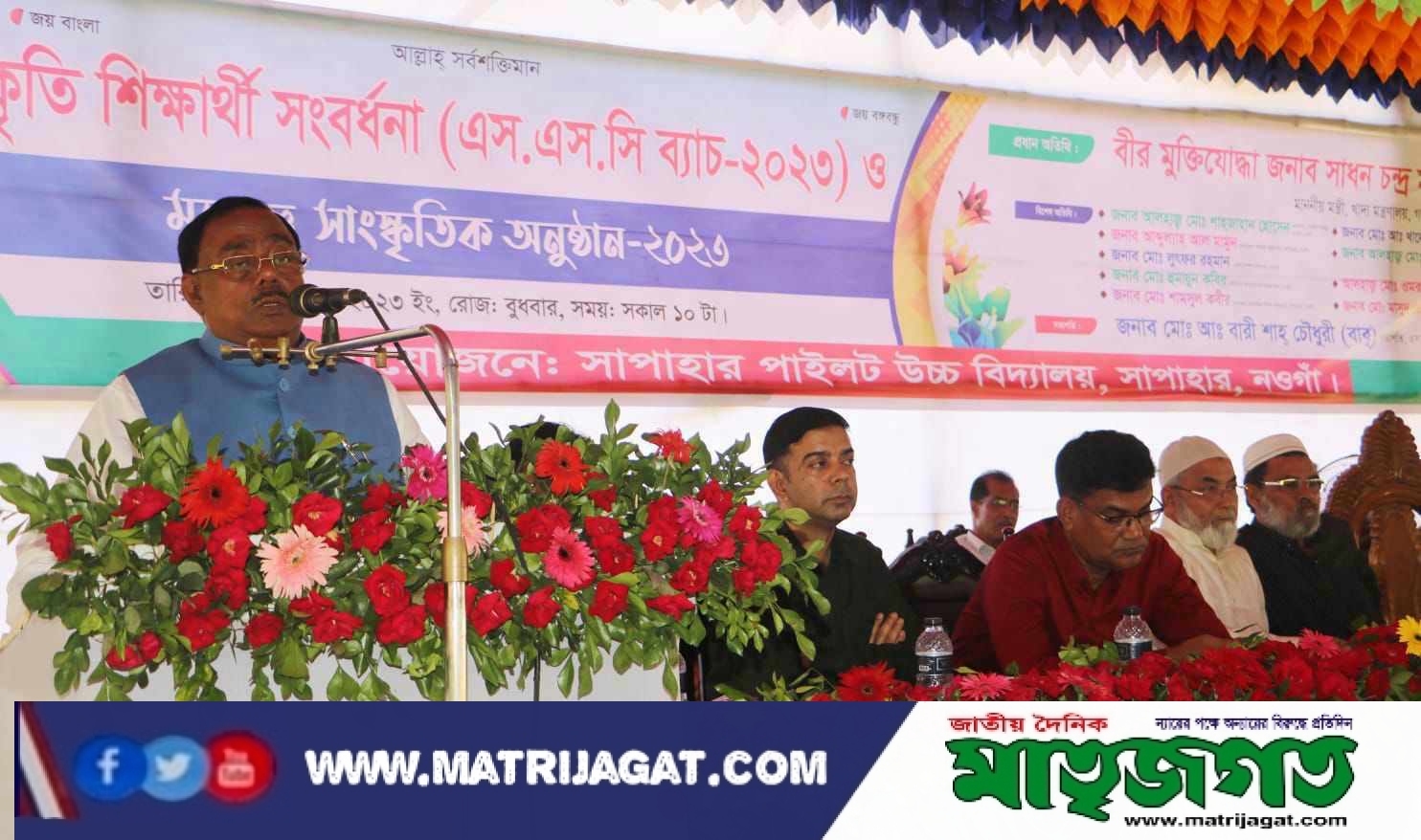 শিক্ষকদের উদ্দেশ্যে খাদ্যমন্ত্রী বলেন,শিক্ষার্থীদের সুশিক্ষায় শিক্ষিত করে দেশের উন্নয়ন অংশীদার হিসেবে গড়তে আপনাদের ভূমিকা গুরুত্বপূর্ণ। এই শিক্ষার্থীদের আগামীর জন্য আত্মবিশ্বাসী করে গড়ে তুলতে হবে। তাদের হাত ধরেই স্মার্ট বাংলাদেশ গঠন হবে সাপাহার পাইলট উচ্চ বিদ্যালয় ম্যানেজিং কমিটির সভাপতি মোঃ আব্দুল বারী শাহ চৌধুরী এর সভাপতিত্বে অনুষ্ঠানে সাপাহার উপজেলা পরিষদের চেয়ারম্যান মোঃ শাহজাহান হোসেন, উপজেলা নির্বাহী অফিসার মোঃ আব্দুল্যাহ আল মামুন, জেলা শিক্ষা অফিসার মোঃ লুৎফর রহমান, সাপাহার থানার অফিসার ইনচার্জ মোঃ হুমায়ুন কবির, সাপাহার উপজেলা আওয়ামী লীগের সভাপতি মোঃ শামসুল আলম শাহ চৌধুরী এবং সাধারণ সম্পাদক মোঃ মাসুদ রেজা সারোয়ার বিশেষ অতিথি হিসাবে বক্তৃতা করেন। স্বাগত বক্তব্য রাখেন সাপাহার পাইলট উচ্চ বিদ্যালয়ের প্রধান শিক্ষক মোঃ সাজেদুল আলম পরে খাদ্যমন্ত্রী সাধন চন্দ্র মজুমদার ২০২৩ সালের এসএসসি পরীক্ষায় সাফল্য অর্জনকারী কৃতি শিক্ষার্থীদের হাতে ক্রেস্ট তুলে দেন।