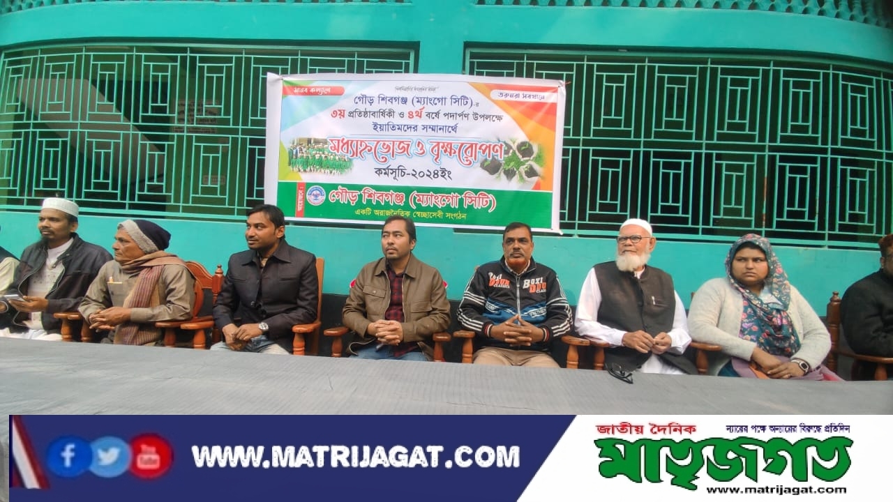 মোহাঃ মাইনুল ইসলাম লাল্টু সিনিয়র স্টাফ রিপোর্টারঃ বৃক্ষ রোপণ, এতিমদের মাঝে খাবার বিতরণ ও আলোচনা সভার মাধ্যমে শিবগঞ্জে মানব সেবা সংস্থা গৌড় ম্যাংগো সিটির তৃতীয় প্রতিষ্ঠা বার্ষিকী পালিত হয়েছে। মঙ্গলবার দুপুরে শিবগঞ্জ একাডেমীর মোড়ে এতিমখানায় এ কর্মসূচী পালন করা হয়। কর্মসূচীর শুরুতেই ম্যাংগো সিটির প্রধান উপদেষ্টা নবজাতক ও শিশু বিশেষজ্ঞ ডা:মাহফুজ রায়হান এ্যানি এতিমখানায় নিজস্ব জমিতে বৃক্ষরোপন করেন। অত:পর এতিম খানা চত্বরে ম্যাংগো সিটির প্রতিষ্ঠাতা আলমগীর জয়ের সভাপতিত্বে আলোচনা সভায় প্রধান অতিথির বক্তব্যে ডা: মাহফুজ রায়হান বলেন আমাদের প্রত্যেকের উচিত নিজস্ব গন্ডি থেকে এতিমদেরকে সাহায্য করার মাধ্যমে তাদেরকে মানুষ হওয়ার সুযোগ প্রদান করা। যা আলমগীর রেজা পালন করে সমাজে গুরুত্বপূর্ন ভূমিকা পালন করে আসছে।তিনি আরো বলেন আলমগীর রেজার এ ধরনের কাজে তার পাশে থেকে সাধ্য অনুযায়ী সহযোগিতা করার চেষ্টা করবো ইনশাল্লাহ। এ সময় আরো উপস্থিত ছিলেন দশ ভাইয়া ফাউন্ডেশনের সাধারণ সম্পাদক আব্দুল হামিদ, ডেলটা মেডিকেল সেন্টারের পরিচালক জাহিদুল ইসলাম,দৈনিক ইত্তেফাকের শিবগঞ্জ সংবাদাদাতা সফিকুল ইসলাম.শিবগঞ্জ গৌড় প্রেস ক্লাবের সভাপতি ও মাতৃজগত পত্রিকার সিনিয়র স্টাফ রিপোর্টার মাইনুল ইসলাম লাল্টু ও উক্ত প্রেসক্লাবের সাধারণ সম্পাদক শামসুন্নাহার সোহানা সহ বিভিন্ন মিডিয়া কর্মী, শিক্ষক, বিভিন্ন শিক্ষা প্রতিষ্ঠানের শিক্ষার্থীরা। আলোচনা শেষে ৩৫ জন এতিমদের মাঝে দুপুরের খাবার বিতরণ করা হয়।