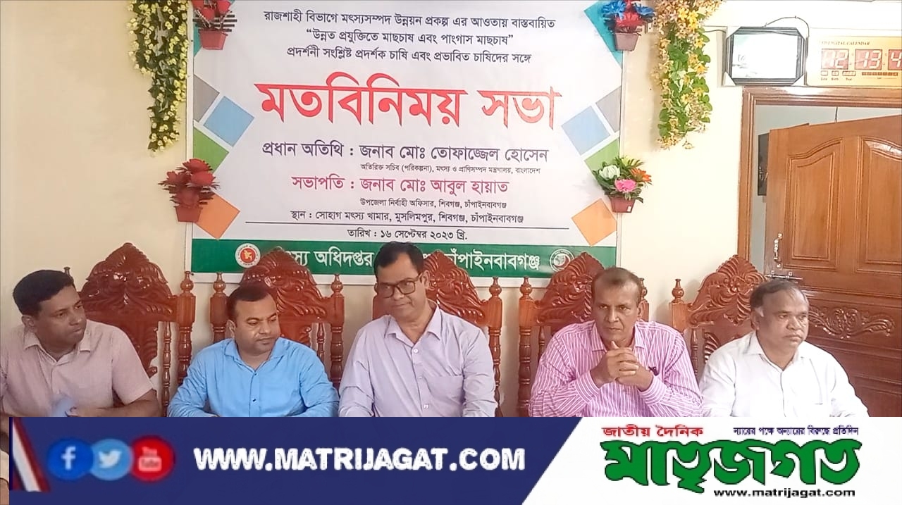 মোহাঃ মাইনুল ইসলাম লাল্টু শিবগঞ্জ (চাঁপাইনবাবগঞ্জ) প্রতিনিধি:চাঁপাইনবাবগঞ্জের শিবগঞ্জে রাজশাহী বিভাগে মৎস্যসম্পদ উন্নয়ন প্রকল্পের আওতায় বাস্তবায়িত উন্নত প্রযুক্তিতে মাছচাষ, ও পাংগাস মাছচাষ প্রদর্শনী সংশ্লিষ্ট প্রদর্শক চাষি ও প্রভাবিত চাষিদের সঙ্গে মতবিনিময় সভা অনুষ্ঠিত হয়েছে। শনিবার দুপুরে মৎস্য অধিদপ্তরের উদ্যোগে উপজেলার মুসলিমপুর সোহাগ মৎস্য খামারে আয়োজিত অনুষ্ঠানে প্রধান অতিথির বক্তব্য রাখেন, মৎস্য ও প্রাণিসম্পদ মন্ত্রণালয়ের অতিরিক্ত সচিব (পরিকল্পনা) মো. তোফাজ্জেল হোসেন।