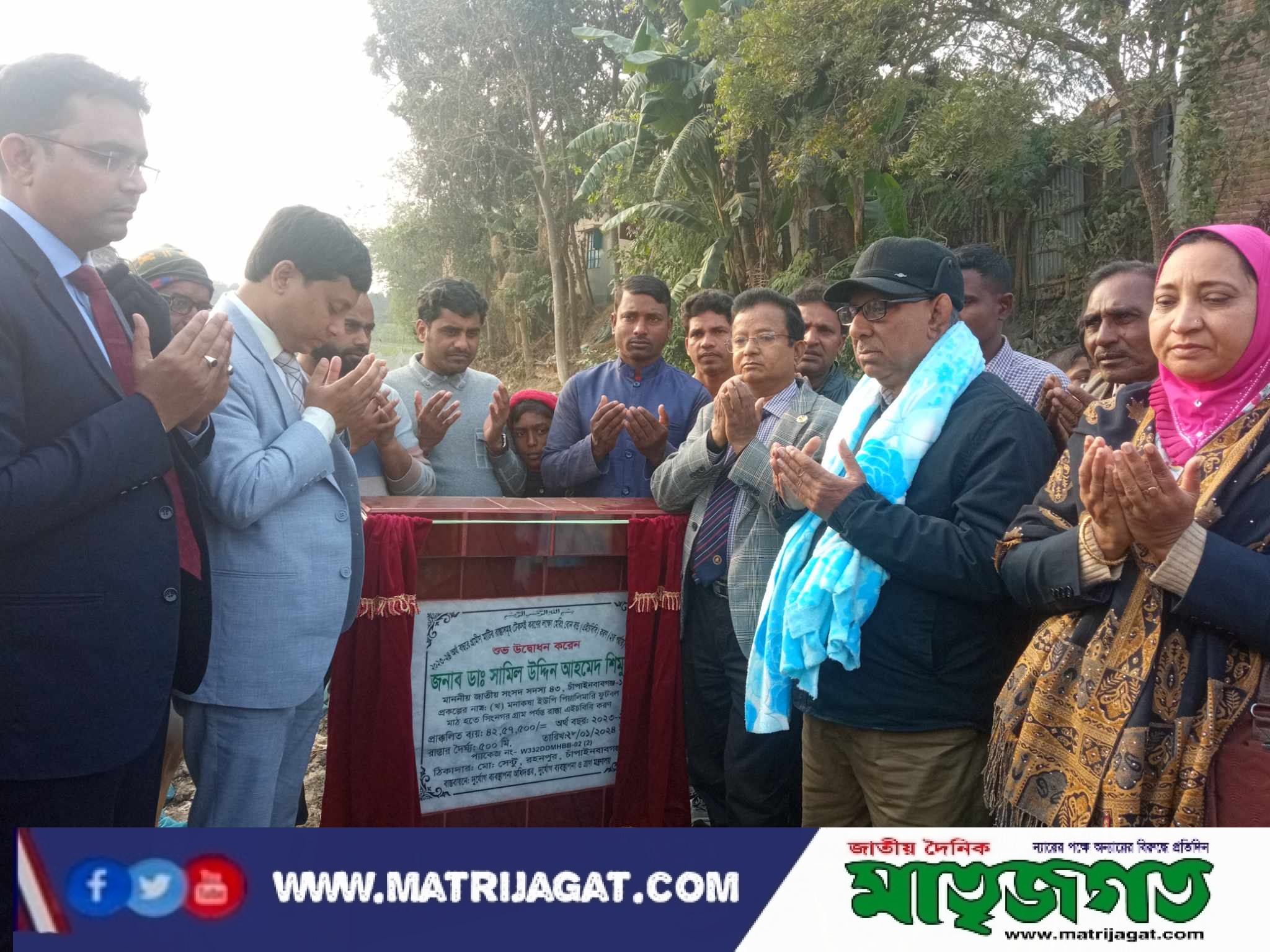 মোহাঃ মাইনুল ইসলাম লাল্টু সিনিয়র স্টাফ রিপোর্টারঃ চাঁপাইনবাবগঞ্জের শিবগঞ্জে নবনির্মিত দুটি সেমিপাকা বাড়ি ও ২ কিলোমিটারের তিনটি সড়কের ভিত্তিপ্রস্তর স্থাপনের উদ্বোধন করা হয়েছে। রোববার বিকেলে দুর্যোগ ব্যবস্থাপনা ও ত্রাণ মন্ত্রণালয়ের তত্ত্বাবধানে ১ কোটি ৭৪ লাখ টাকা ব্যয়ে নবনির্মিত দুটি সেমিপাকা বাড়ি ও তিনটি সড়কের ভিত্তিপ্রস্তর স্থাপনের উদ্বোধন করেন সংসদ সদস্য ডা. সামিল উদ্দিন আহমেদ শিমুল। সড়কগুলো হলো- উপজেলার দুর্লভপুর ইউনিয়নের নামোজগন্নাথপুর টেরাপাড়া হতে ফোকলাপাড়া পর্যন্ত ৫০০ মিটার, তেলকুপি পাকা রাস্তা হতে মকবুলের জমি পর্যন্ত ১ কিলোমিটার ও মনাকষার পিয়ালীমারী মাঠ হতে শিংনগর গ্রাম পর্যন্ত ৫০০ কিলোমিটার সড়ক। পরে চর শিংনগর সরকারি প্রাথমিক বিদ্যালয় মাঠে উদ্বোধনী অনুষ্ঠানে উপজেলা নির্বাহী কর্মকর্তা এএফএম আবু সুফিয়ানের সভাপতিত্বে অন্যদের মধ্যে বক্তব্য রাখেন, উপজেলা পরিষদের মহিলা ভাইস চেয়ারম্যান শিউলী বেগম, উপজেলা প্রকল্প বাস্তবায়ন কর্মকর্তা প্রকৌশলী আরিফুল ইসলাম, মনাকষা ইউপি মির্জা শাহাদাৎ হোসেন খুররম ও উপজেলা আওয়ামী লীগের যুগ্ম সাধারণ সম্পাদক তোহিদুল আলম টিয়াসহ অন্যরা। এছাড়া স্থানীয় আওয়ামী লীগ ও অঙ্গ সহযোগি সংগঠনের নেতৃবৃন্দ উপস্থিত ছিলেন। উপকারভোগীরা হলেন- মনাকষা ইউনিয়নের সংরক্ষিত নারী সদস্য শাহনাজ পারভিন লিলি বেগম ও একবরপুর গ্রামের বাসিন্দা আশরাফুল ইসলাম।