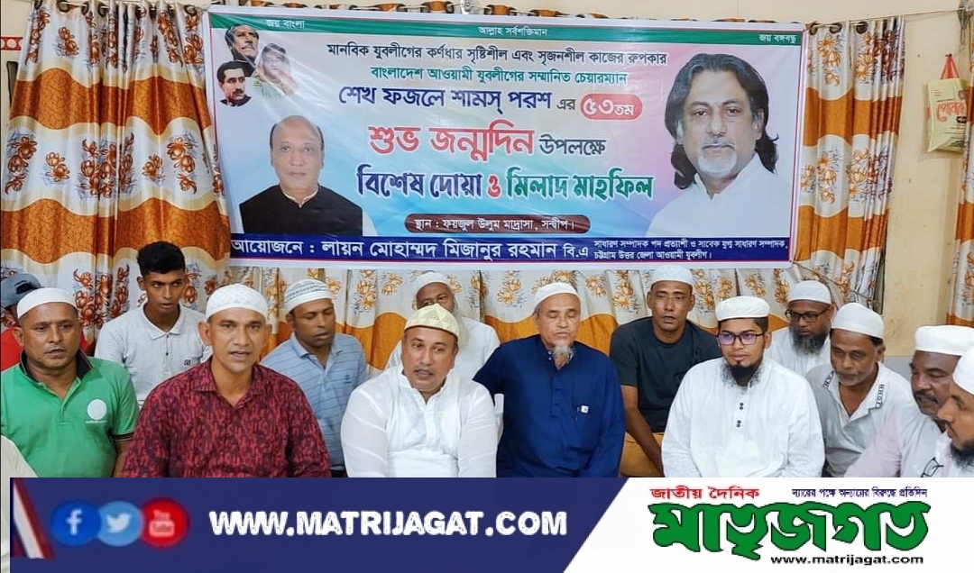শেখ ফজলে শামস পরশের জন্মদিন উপলক্ষে সন্দ্বীপে লায়ন মিজানুর রহমানের আয়োজনে বিশেষ দোয়া ও মিলাদ মাহফিল অনুষ্ঠিত।