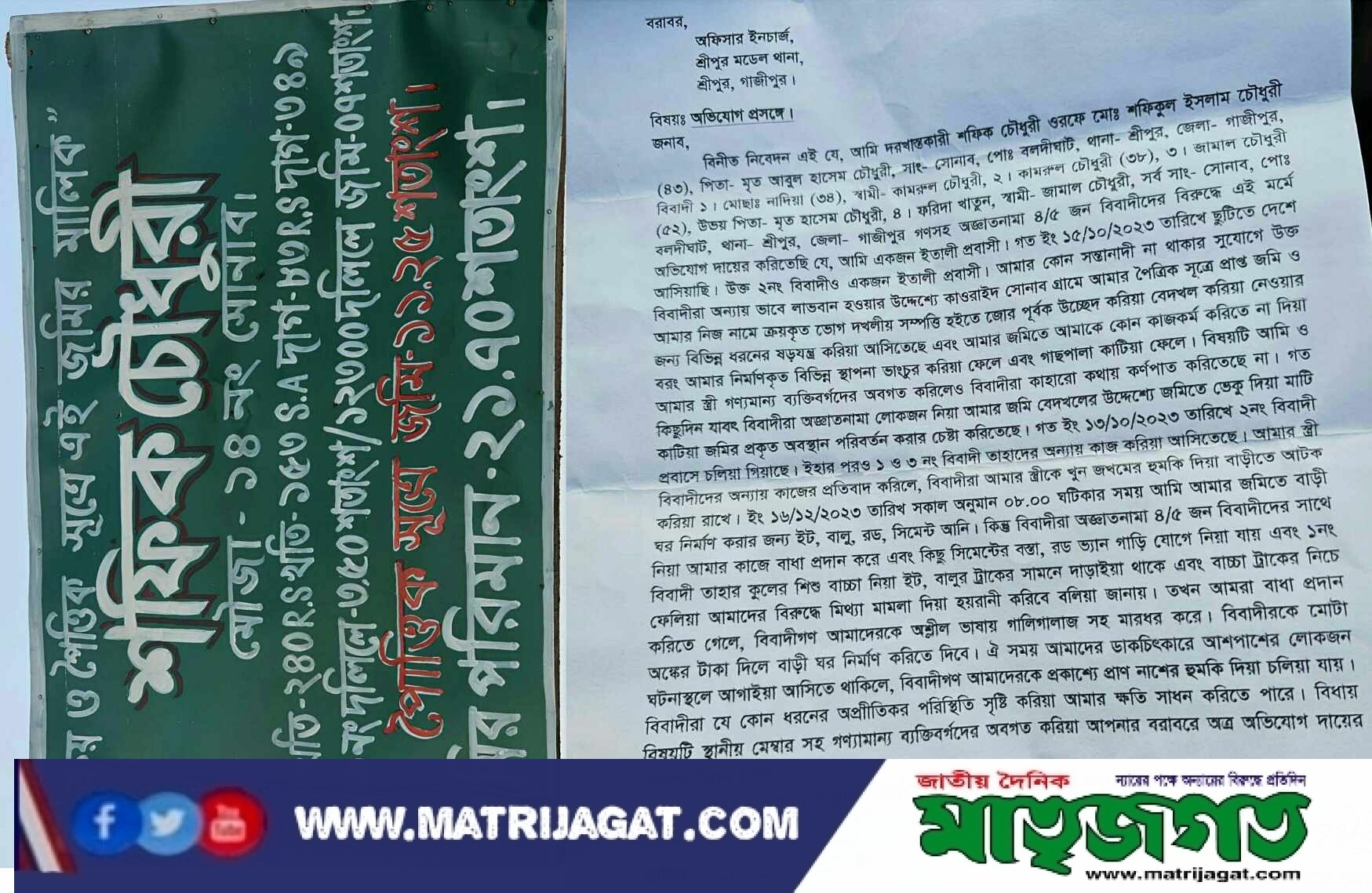 শ্রীপুরে, প্রবাসীকে ক্রয় ও পৈত্রিক জমি থেকে উচ্ছেদের চেষ্টা, থানায় অভিযোগ