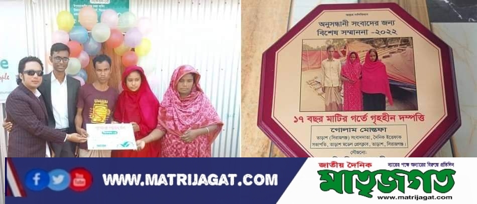 দৈনিক ইত্তেফাকের তাড়াশ সংবাদদাতা ও তাড়াশ মডেল প্রেসক্লাবের সভাপতি গোলাম মোস্তফাকে অনুসন্ধানী সাংবাদিতার জন্য বিশেষ সম্মাননা পদক দিয়েছেন সেই গৃহহীন রুহুল আমিন ও রেহেনা দম্পত্তি। সিরাজগঞ্জ জেলার তাড়াশ উপজেলার বারুহাস ইউনিয়নের দিঘরিয়া গ্রামের সরদার পাড়াতে রুহুল আমিনের বাড়ি।