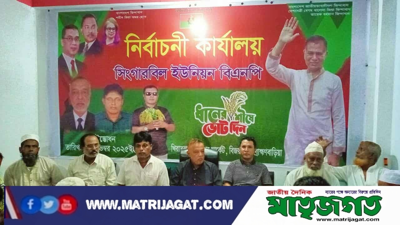 ব্রাহ্মণবাড়িয়া বিজয়নগর উপজেলার সিংগারবিল ইউনিয়নের খিরাতলা কাঞ্চনপুর মার্কেটে সিংগারবিল ইউনিয়ন বিএনপির নির্বাচনী কার্যালয়ের শুভ উদ্বোধন অনুষ্ঠিত হয়েছে। শনিবার (১ নভেম্বর) সন্ধ্যা ৬টায় ইউনিয়ন বিএনপির সাংগঠনিক সম্পাদক ইখতিয়ার হোসেন ইকতার-এর নিজস্ব অর্থায়নে এই কার্যালয়ের উদ্বোধন করা হয়। অনুষ্ঠানে সভাপতিত্ব করেন বিএনপি নেতা মোহাম্মদ রুমজ আলী, এবং সঞ্চালনায় ছিলেন, সিংগারবিল ইউনিয়ন বিএনপির সাধারণ সম্পাদক মোঃ সজল মিয়া। প্রধান অতিথি হিসেবে উপস্থিত ছিলেন সিংগারবিল ইউনিয়ন বিএনপির সভাপতি মোঃ রেহান উদ্দিন ভূঁইয়া। পবিত্র কোরআন তেলাওয়াতের মাধ্যমে অনুষ্ঠানের সূচনা করেন হাফেজ কারী জাহিদুল ইসলাম। পরে বিএনপি ও এর অঙ্গসংগঠনের বিভিন্ন পর্যায়ের নেতৃবৃন্দ উপস্থিত থেকে বক্তব্য রাখেন। অনুষ্ঠানে আরও উপস্থিত ছিলেন— ব্রাহ্মণবাড়িয়া জেলা বিএনপির সাবেক সংগ্রামী সদস্য হেলাল উদ্দিন ভূঁইয়া, বিজয়নগর উপজেলা বিএনপির আহবায়ক কমিটির সদস্য মোহাম্মদ জলিল সরকার, উপজেলা বিএনপির সদস্য মোহাম্মদ আকতার হাজী, উপজেলা স্বেচ্ছাসেবক দলের আহ্বায়ক মোহাম্মদ সাঈদ খোকন, জেলা ছাত্রদলের সাবেক সহ-সভাপতি মোহাম্মদ আবু তাহের ভূঁইয়া, পত্তন ইউনিয়ন বিএনপির সহ-সাংগঠনিক সম্পাদক মোঃ সোহাগ ভূঁইয়া, উপজেলা স্বেচ্ছাসেবক দলের সিনিয়র যুগ্ম আহ্বায়ক মোহাম্মদ নাসির উদ্দিন, সিংগারবিল ইউনিয়ন যুবদলের সাধারণ সম্পাদক মোঃ মাসুম মিয়া, সহ-সভাপতি মোহাম্মদ আজিজুল হক ও মোঃ জুয়েল মুন্সি প্রমুখ। এ সময় বক্তারা বলেন,আমাদের গণমানুষের নেতা জনাব তারেক রহমান এর নির্দেশে আসন্ন জাতীয় সংসদ নির্বাচনের প্রস্তুতি হিসেবে আমরা মাঠে-ময়দানে সক্রিয় রয়েছি। ঐক্যবদ্ধভাবে কাজ করে সুষ্ঠু নির্বাচনী পরিবেশ নিশ্চিত করতে হবে, যেন কোনো বহিরাগত শক্তি বিশৃঙ্খলা সৃষ্টি করতে না পারে। সিংগারবিল ইউনিয়ন বিএনপি সবসময় জনগণের পাশে ছিল এবং থাকবে।” তারা আরও বলেন, “আগামী নির্বাচনে তিতাসপাড়ের অহংকার, জননন্দিত নেতা ইঞ্জিনিয়ার খালেদ হোসেন মাহবুব শ্যামল ভাইকে ধানের শীষ প্রতীকে বিজয়ী করতে আমরা ঘরে ঘরে গিয়ে প্রচার চালিয়ে যাচ্ছি। এই নির্বাচনী কার্যালয় উদ্বোধনের মাধ্যমে আমাদের প্রচারণা কার্যক্রম আরও গতিশীল হবে বলে আমরা মনে করি।