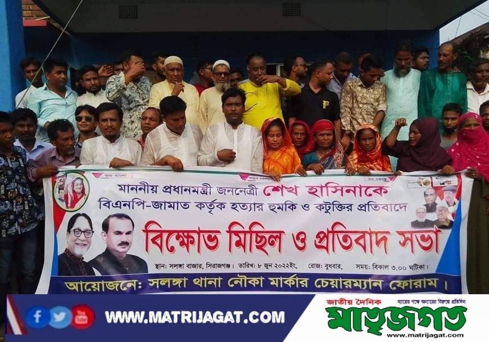 সিরাজগঞ্জের সলঙ্গায় জাতির জনক বঙ্গবন্ধু কন্যা প্রধান মন্ত্রী শেখ হাসিনা কে জামাত-বি এন পি কর্তৃক হত্যার হুমকির ও কুটক্তির প্রতিবাদে সলঙ্গা থানা নৌকা মার্কার চেয়ারম্যান ফোরাম এর উদ্যোগে বিক্ষোভ মিছিল ও প্রতিবাদ সভা অনুষ্ঠিত হয়।
