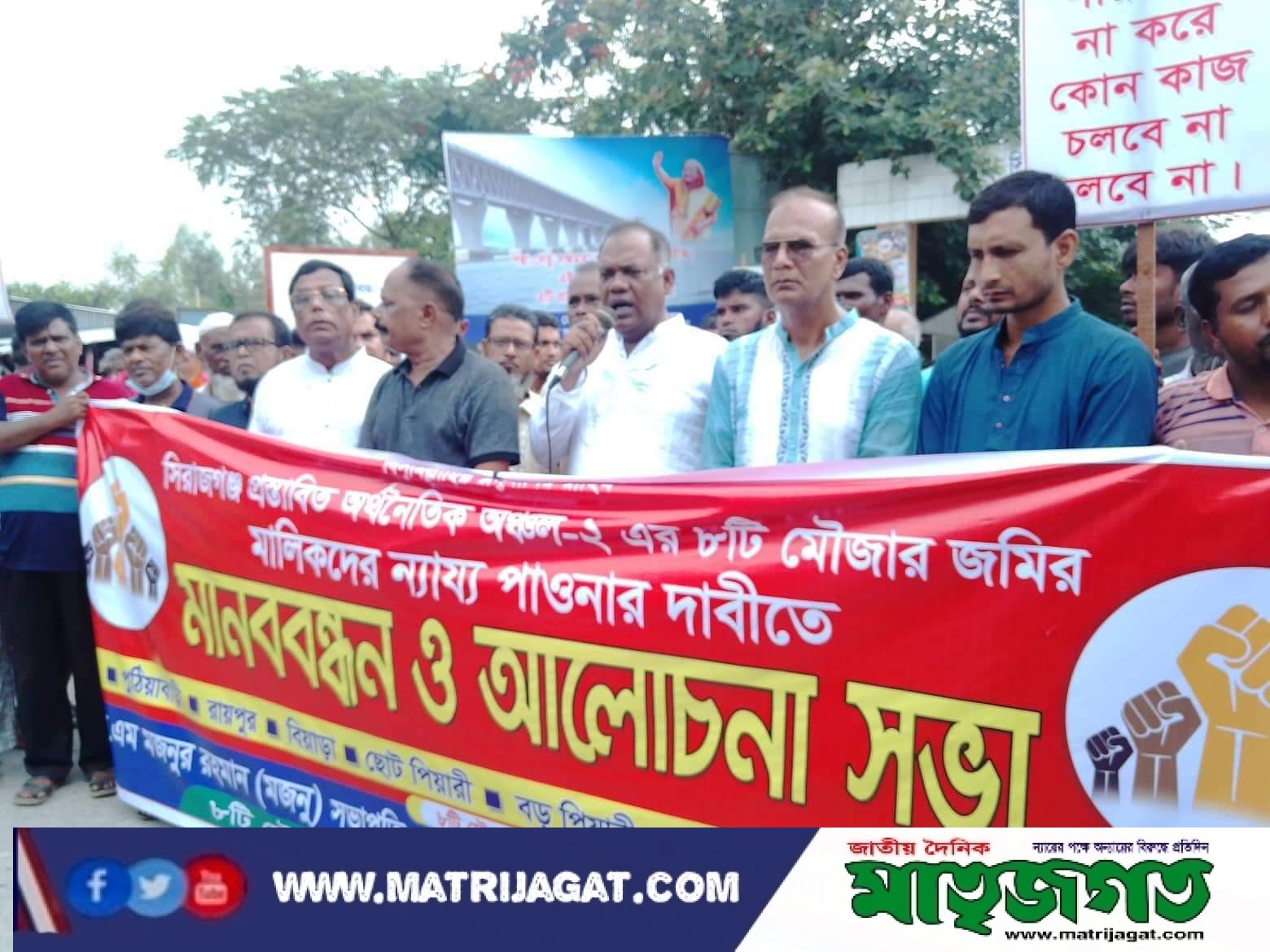 ৮ মৌজার জমি মালিকদের স্বার্থরক্ষা সংরক্ষণ কমিটির সভাপতি এস এম মজনুর রহমানের সভাপতিত্বে ও জেলা কৃষকলীগের সাধারন সম্পাদক এস এম মনিরুজ্জামান মনির সঞ্চালনায় মানববন্ধনে প্রধান অতিথি হিসেবে বক্তব্য রাখেন, সিরাজগঞ্জ পৌর আওয়ামী লীগের সভাপতি হেলাল উদ্দিন, জেলা আওয়ামী লীগের সাবেক তথ্য ও গবেষণা সম্পাদক আনোয়ার হোসেন ফারুক, সদর উপজেলা পরিষদের ভাইস চেয়ারম্যানএসএম নাছিম রেজা নূর দিপু, পৌর আওয়ামী লীগের সাবেক যুগ্ম সম্পাদক নজরুল ইসলাম হাসেম, ৮ মৌজার জমি মালিকদের স্বার্থরক্ষা সংরক্ষণ কমিটির সাধারন সম্পাদক ও সাংগঠনিক রফিকুল ইসলাম, কোষাধ্যক্ষ আলী আহম্মেদ, জেলা ছাত্রলীগের সাংগঠনিক সম্পাদক জামিউর রহমান উল্লাস প্রমূখ।