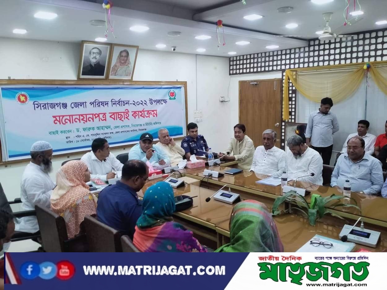আসন্ন সিরাজগঞ্জ জেলা পরিষদ নির্বাচন -২০২২ উপলক্ষে মনোনয়নপত্র চুড়ান্ত বাছাই কার্যক্রম অনুষ্ঠিত হয়েছে। রবিবার ( ১৮ সেপ্টেম্বর) দুপুর ১২ টায় শহিদ শামসুদ্দিন সম্মেলন কক্ষে মনোনয়চনপএ বাছাই কার্যক্রম অনুষ্ঠিত হয়।