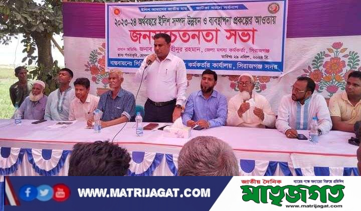 সোমবার (২৯ এপ্রিল -২০২৪) সকাল সাড়ে ১০টায় সিরাজগঞ্জ সদর উপজেলার ছোনগাছা ইউনিয়নের যমুনা নদীর তীরবর্তী পাঁচঠাকুরী অংশে আয়োজিত জনসচেতনতা সভায় প্রধান অতিথি হিসেবে বক্তব্য রাখেন ,সিরাজগঞ্জ জেলার সুযোগ্য জেলা মৎস্য কর্মকর্তা মোঃ শাহীনূর রহমান এসময়ে তিনি তার বক্তব্যে বলেন, ইলিশ মাছ আমাদের জাতীয় মাছ, জাটকা ইলিশ সংরক্ষণে সবারই দায়িত্ব রয়েছে। ইলিশের উৎপাদন বৃদ্ধি করতে দু' মাস সব ধরনের মাছ ধরা যাবে না। অভায় আশ্রম এলাকায় ও মাছ ধরা নিষেধ। সরকারি নিষেধাজ্ঞা উপেক্ষা কেউ মাছ ধরলে জেল জরিমানা। নিষেধাজ্ঞাকালের জন্য নিবন্ধিত জেলেদের জন্য প্রতি জেলেকে ৪০ কেজি করে ভিজিএ চাল দেওয়া হয়েছে। জেলেদের বিকল্প কর্মসংস্থান সৃষ্টির লক্ষ্যে বকনা বাছুর গরু বিতরণ করা হয়েছে।