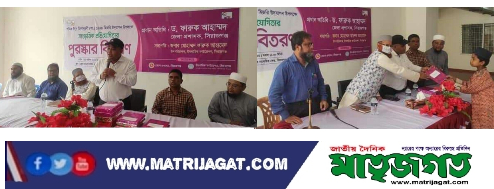 সাথী সুলতানা সিরাজগঞ্জ জেলা প্রতিনিধিঃ-সিরাজগঞ্জ পবিত্র ঈদে মিলাদুন্নবী (সাঃ) ১৪৪৪ হিজরি উপলক্ষে সাংস্কৃতিক প্রতিযোগিতার পুরস্কার বিতরণী অনুষ্ঠান করা হয়েছে। এতে জেলা প্রশাসন ও ইসলামিক ফাউন্ডেশন সিরাজগঞ্জের আয়োজনে বুধবার (২৬ অক্টোবর) বেলা সাড়ে ১১ টায় সিরাজগঞ্জ জেলা মডেল মসজিদ ও ইসলামিক সাংস্কৃতিক কেন্দ্রে মাদ্রাসা'র শিক্ষার্থীদের মাঝে সাংস্কৃতিক প্রতিযোগিতার পুরস্কার বিতরণ অনুষ্ঠানে প্রধান অতিথি হিসেবে পুরস্কার বিতরণ করেন, জেলা প্রশাসক ড. ফারুক আহাম্মদ।