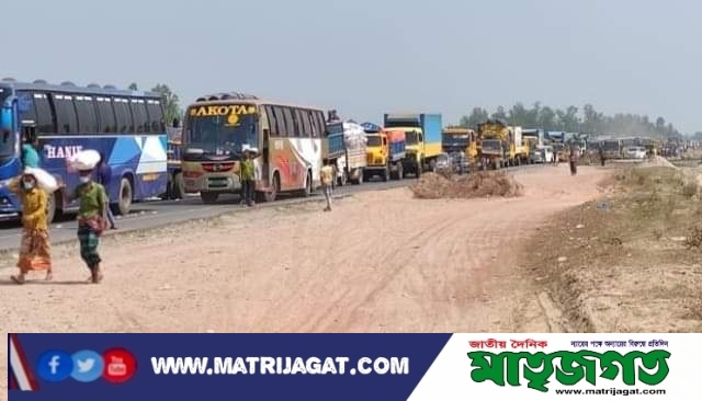 জেলা ব্যুরো সিরাজগঞ্জঃ সিরাজগঞ্জ বঙ্গবন্ধু সেতুর পশ্চিম সংযোগ মহাসড়ক থেকে হাটিকুমরুল গোল চত্তর পর্যন্ত প্রায় ২০ কিলোমিটার রাস্তায় নির্মাণ ও সংস্কার কাজ চলার কারণে দীর্ঘ যানজটের সৃষ্টি হয়েছে। এক লেন দিয়ে যান চলাচল চলছে ধীরগতিতে। চৈত মাসের প্রখর রোদের মধ্যে চরম দুর্ভোগ পোহাতে হচ্ছে যাত্রী সাধারণের। মঙ্গলবার (১৫ মার্চ) ভোর থেকে এ যানজটের সৃষ্টি হয়। ঢাকাগামী ও উত্তরবঙ্গগামী পরিবহন যাত্রীদের চরম দুর্ভোগ পোহাতে হচ্ছে এ যানজটের কারণে। মহাসড়কের চার লেনের কাজ ও নলকা সেতুর সংস্কার কাজ চলার কারণে কিছুদিন পরপরই ঘটছে এমন ঘটনা। এতে উত্তরবঙ্গ থেকে ঢাকাগামী কাচামাল পরিবহন গুলো পড়েছেন বিপাকে দীর্ঘ সময় যানজটে আটকে থেকে সঠিক সময়ে পণ্য পৌঁছাতে পারছেন না। এতে করে পৌঁছানোর আগেই কাঁচামাল গুলো নষ্ট হয়ে যাওয়ার সম্ভাবনা রয়েছে বলে জানিয়েছেন পণ্য পরিবহন শ্রমিকরা। এছাড়াও ঢাকা থেকে উত্তরবঙ্গ গামী ও উভয় পাশের যাত্রীদের ভোগান্তি পোহাতে হচ্ছে। ১০ মিনিটের রাস্তায় দুই থেকে তিন ঘণ্টা আটকা পড়ে রয়েছেন। যানযট নিরসনে হাটিকুমরুল হাইওয়ে থানার পুলিশ সহ সিরাজগঞ্জ ট্রাফিক পুলিশ সলঙ্গা থানা ও রায়গঞ্জ থানা পুলিশ সবাই নিয়মিত কাজ চালিয়ে যাচ্ছেন। মহাসড়কে চার লেন নির্মাণ ও নলকা সেতুর সংস্কার কাজ চলমান থাকায় এক লেন দিয়েই ঢাকাগামী ও উত্তরবঙ্গগামী যানবাহন চলাচল করাতে হচ্ছে।