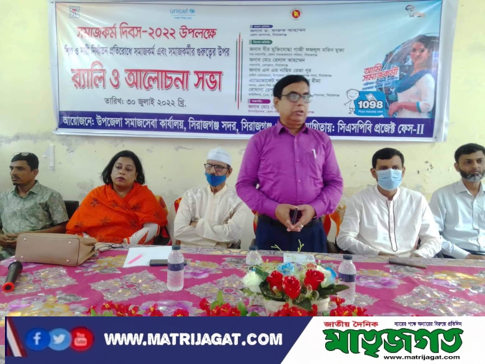 সিরাজগঞ্জে "সমাজকর্ম দিবস"-২০২২ উপলক্ষে শিশু ও নারী নির্যাতন প্রতিরোধে সমাজকর্মী এবং সমাজকর্মীর গুরুত্বের উপর র্যালি ও আলোচনা সভা অনুষ্ঠিত হয়েছে। সিরাজগঞ্জ শহর, সদর উপজেলা ও জেলা সমাজসেবা অধিদপ্তরের আয়োজনে- এবং সিএসপিবি প্রজেক্ট ফেস--II এর সহযোগিতায়-