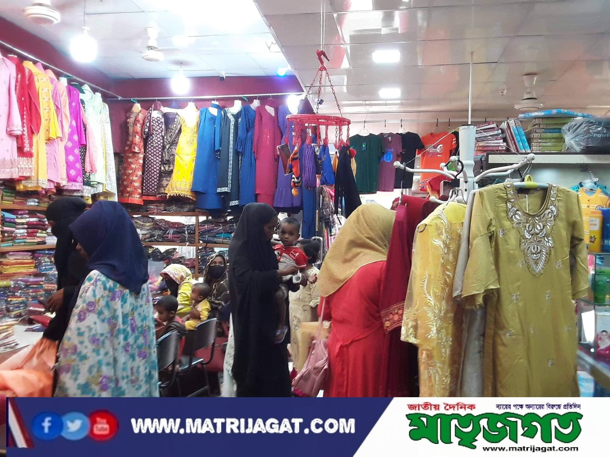 সিরাজগঞ্জ রায়গঞ্জে জমে উঠেছে আগাম ঈদের নতুন পোশাক কেনাকাটা-ব্যস্ত মালিক ও কর্মচারীরা