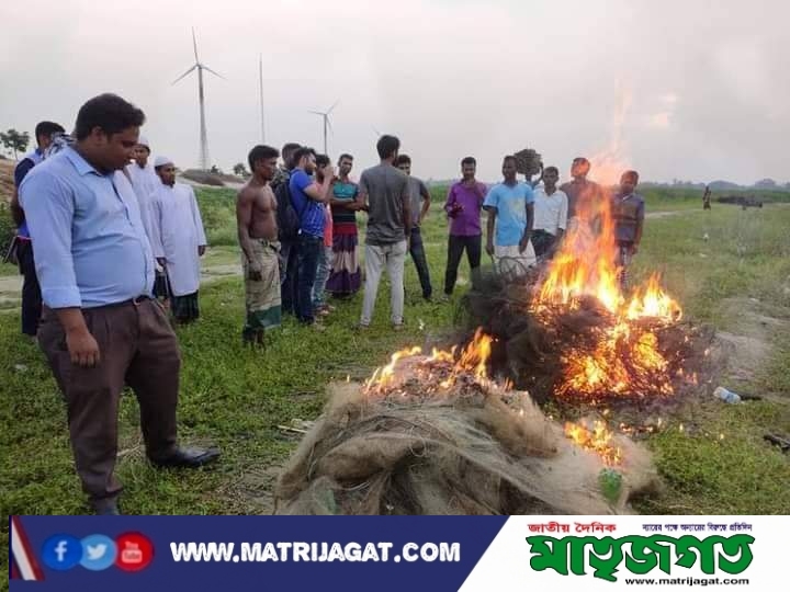 সিরাজগঞ্জ সদরে যমুনা নদীতে জাটকা সংরক্ষণ অভিযানে অবৈধ জাল পুড়ে ধ্বংস।