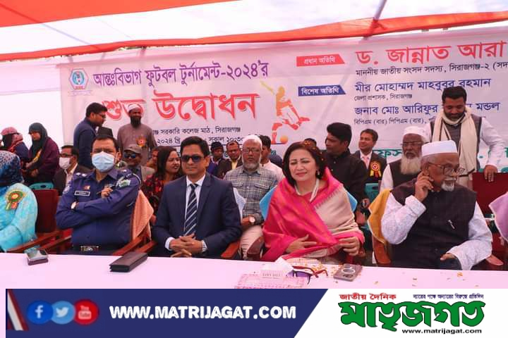 সোমবার (১২ ফেব্রুয়ারী) সকাল সাড়ে ১০ টায় ্কলেজ মাঠে আন্তঃজেলা বিভাগ ফুটবল টুর্নামেন্টের শুভ উদ্বোধন করেন, সিরাজগঞ্জ -২ সদর-কামারখন্দ আসনের জাতীয় সংসদ সদস্য ড. জান্নাত আরা তালুকদার হেনরী এসময়ে তিনি তার বক্তব্যে বলেন, নতুন প্রজন্মদের সকলকে সুশিক্ষা অর্জন করার পাশাপাশি আধুনিক প্রযুক্তি গ্রহণ করে উন্নত সমৃদ্ধি শালী স্মার্ট বাংলাদেশ দেশ গড়তে হবে এজন্য সকলকে ভালো মানুষ হতে হবে। শিক্ষা, ক্রীড়া, সাহিত্য সংস্কৃতির লালন করতে হবে। খেলাধূলার বিকল্প নেই।