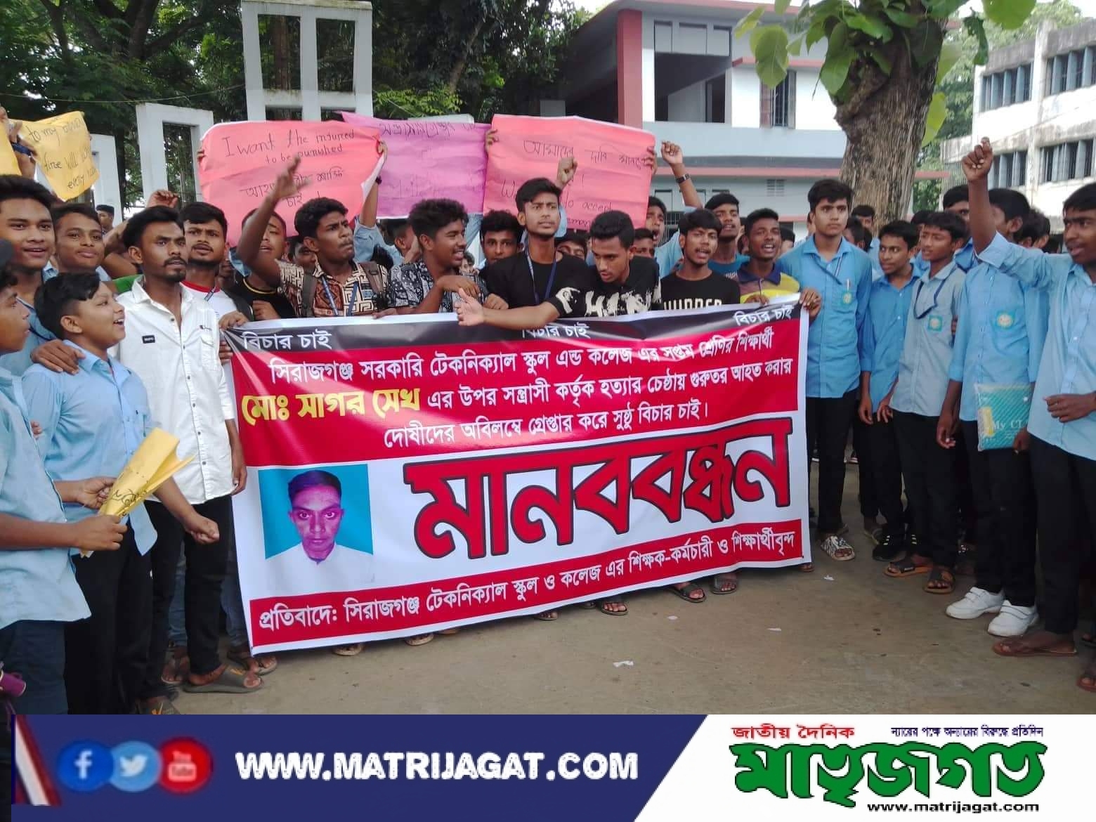 সাগরের উপর সন্ত্রাসীদের নিঃস্বংস হামলার প্রতিবাদে ও হামলাকারীদের চিহ্নিত করে দৃষ্টান্তমূলক শাস্তির দাবি জানিয়ে সিরাজগঞ্জ সরকারি টেকনিক্যাল স্কুল এন্ড কলেজের শিক্ষক কর্মচারী ও শিক্ষার্থীরা বৃহস্পতিবার ৩০ জুন সকালে প্রতিষ্ঠান চত্বরে এক মানববন্ধন করে। মানববন্ধন শেষে অত্র প্রতিষ্ঠানের শিক্ষার্থীরা শহরের প্রধান প্রধান সড়ক করে।