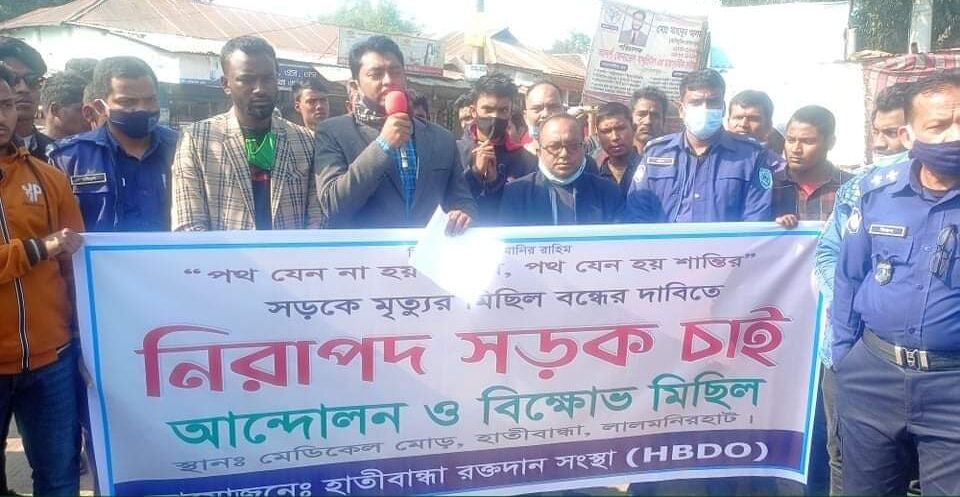 হাতীবান্ধায় নিরাপদ মহাসড়কের দাবিতে অবরোধ ও মানববন্ধন।