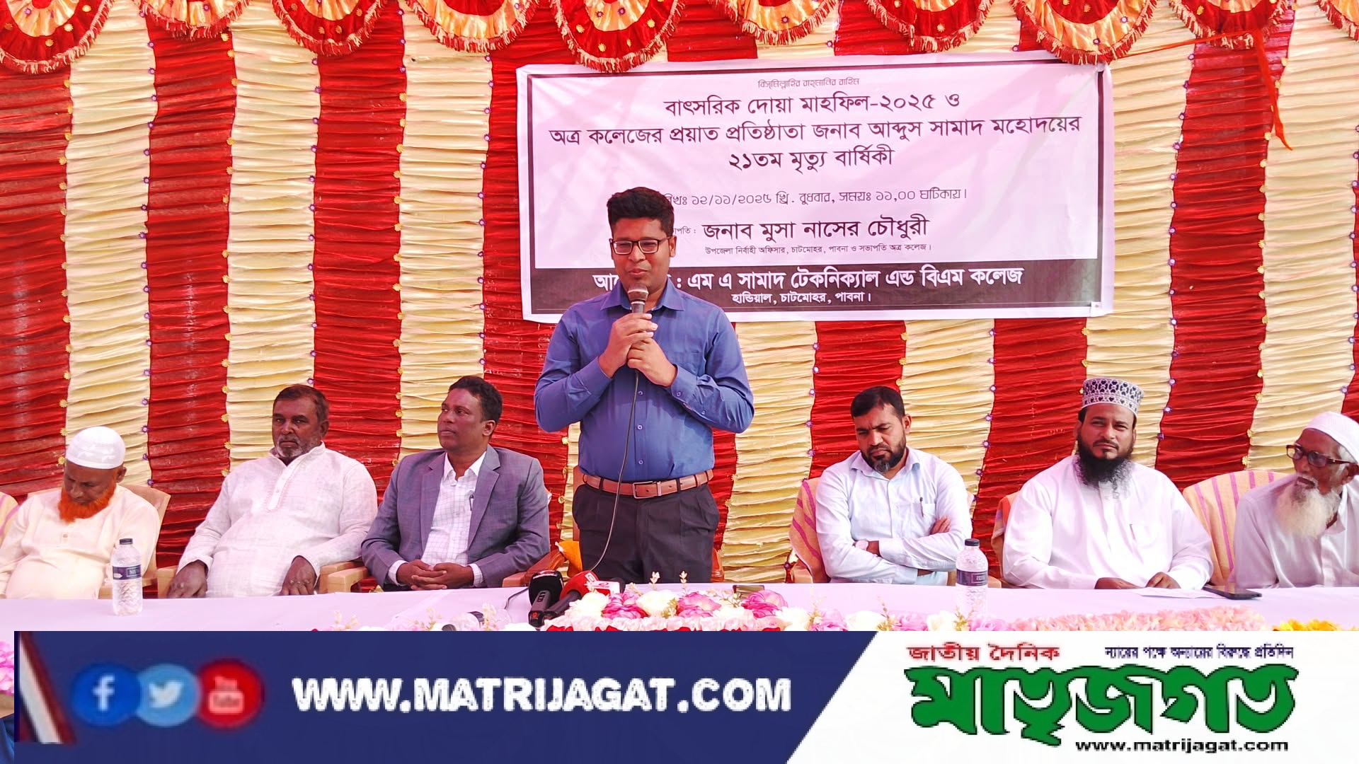 সোহেল রানা জয়ের রিপোর্ট পাবনার চাটমোহর উপজেলার হান্ডিয়ালে এম এ সামাদ টেকনিক্যাল এন্ড বিএম কলেজ-এর প্রতিষ্ঠাতা প্রয়াত মোঃ আব্দুস সামাদ মহোদয়ের ২১তম মৃত্যুবার্ষিকী উপলক্ষে বুধবার (১২ নভেম্বর) দোয়া মাহফিল ও আলোচনা সভা অনুষ্ঠিত হয়েছে। কলেজ পরিচালনা কমিটির সভাপতি ও চাটমোহর উপজেলা নির্বাহী অফিসার মুসা নাসের চৌধুরী অনুষ্ঠানের সভাপতিত্ব করেন। প্রধান আলোচক ছিলেন কলেজের অধ্যক্ষ মোঃ রেজাউল করিম হেলাল এবং কলেজের দাতা সদস্য ও হান্ডিয়াল ইউনিয়ন বিএনপির সাবেক সভাপতি মোঃ আবু হানিফ। বিশেষ অতিথি হিসেবে উপস্থিত ছিলেন হান্ডিয়াল পুলিশ তদন্ত কেন্দ্রের ইনচার্জ আতিকুর রহমান, হান্ডিয়াল কলেজের অধ্যক্ষ মোঃ মহসিন আলম, আটলংকা এম এ মাহমুদ টেকনিক্যাল কলেজের অধ্যক্ষ মাহমুদুল আলম, জিন্দানী ডিগ্রী কলেজের ভারপ্রাপ্ত অধ্যক্ষ মোঃ বেলাল হোসেন, হান্ডিয়াল উচ্চ বিদ্যালয়ের ভারপ্রাপ্ত প্রধান শিক্ষক মোঃ মোজাহার আলী, আশরাফ জিন্দানী উচ্চ বিদ্যালয়ের প্রধান শিক্ষক মোঃ আসাদুজ্জামান, রাজশাহী কৃষি উন্নয়ন ব্যাংকের সাবেক প্রিন্সিপাল অফিসার মোঃ শহিদুল ইসলাম, সাবেক শিক্ষক মোঃ আব্দুর রাজ্জাক, সাবেক সাধারণ সম্পাদক ইসমাইল হোসেন ও মোঃ ছহির উদ্দিন স্বপন, এবং সাবেক শিক্ষক মোঃ মোক্তার হোসেন। অনুষ্ঠানে আরও উপস্থিত ছিলেন চাটমোহর পরিসংখ্যান অফিসার মোঃ মেহেদী হাসান, হান্ডিয়াল কৃষক দলের সাবেক সভাপতি মোঃ আব্দুল হান্নান খোকন, হান্ডিয়াল প্রেসক্লাবের সাধারণ সম্পাদক মোঃ সোহেল রানা জয়সহ এলাকার গণ্যমান্য ব্যক্তিবর্গ, শিক্ষক, কর্মচারী ও শিক্ষার্থীবৃন্দ। সভাপতির বক্তব্যে উপজেলা নির্বাহী অফিসার মুসা নাসের চৌধুরী বলেন, “প্রয়াত আব্দুস সামাদ ছিলেন এক দূরদর্শী শিক্ষানুরাগী ও সমাজসেবক। আমরা তাঁর দেখানো পথে চললে তাঁর আত্মার প্রতি শ্রদ্ধা জানানো সম্ভব হবে।” অধ্যক্ষ মোঃ রেজাউল করিম হেলাল বলেন, “কলেজের প্রতিটি সাফল্যের পেছনে প্রয়াত আব্দুস সামাদ সাহেবের অক্লান্ত পরিশ্রম ও অবদান রয়েছে। আমরা তাঁর স্বপ্ন পূরণে সর্বোচ্চ প্রচেষ্টা চালিয়ে যাচ্ছি।” দাতা সদস্য মোঃ আবু হানিফ বলেন, “আব্দুস সামাদ মানবতার দৃষ্টান্ত। শিক্ষা ও সমাজ উন্নয়নে তিনি অনন্য ভূমিকা রেখেছেন।” অনুষ্ঠান সঞ্চালনা করেন কলেজের শিক্ষক মোঃ খাইরুল ইসলাম, এবং দোয়া ও মোনাজাত পরিচালনা করেন পাকপাড়া আলিম মাদ্রাসার প্রভাষক মাওলানা মোঃ তারিকুল ইসলাম।