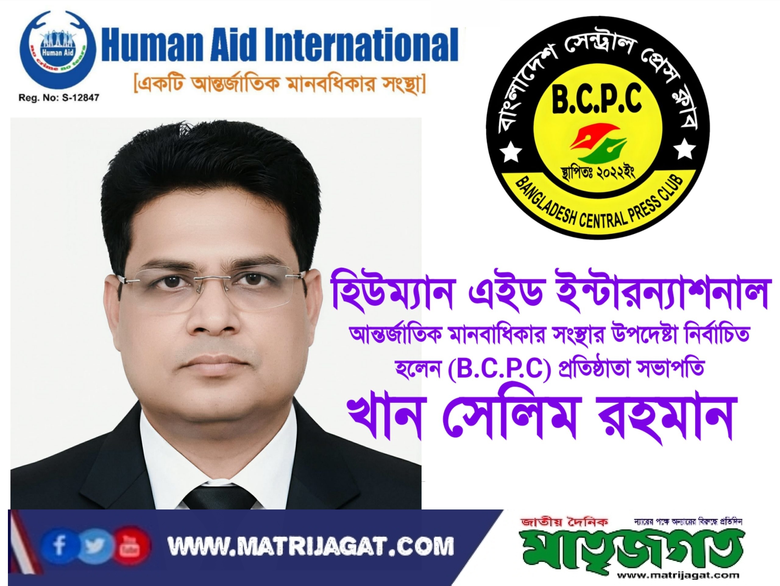 বাংলাদেশ সেন্ট্রাল প্রেস ক্লাব (B.C.P.C)-এর প্রতিষ্ঠাতা সভাপতি, বিশিষ্ট সাংবাদিক ও মানবাধিকার কর্মী খান সেলিম রহমান আন্তর্জাতিক মানবাধিকার সংস্থা এর উপদেষ্টা পরিষদের স্থায়ী সদস্য হিসেবে নির্বাচিত হয়েছেন। তাঁর এ নির্বাচনে দেশের মানবাধিকার অঙ্গন, সাংবাদিক সমাজ ও সুশীল মহলে ব্যাপক সন্তোষ ও আশাবাদ ব্যক্ত করা হয়েছে।