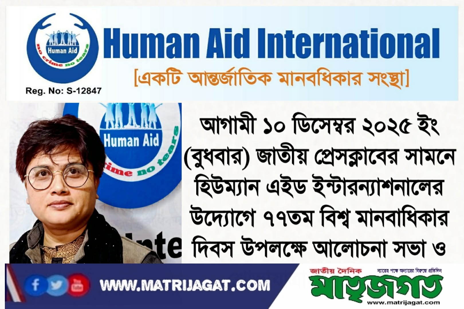 সাঈদা সুলতানা: আগামী ১০ ডিসেম্বর ২০২৫ (বুধবার) জাতীয় প্রেসক্লাবের সামনে হিউম্যান এইড ইন্টারন্যাশনাল এর উদ্যোগে ৭৭তম বিশ্ব মানবাধিকার দিবস উপলক্ষে আলোচনা সভা ও শোভাযাত্রা অনুষ্ঠিত হবে।