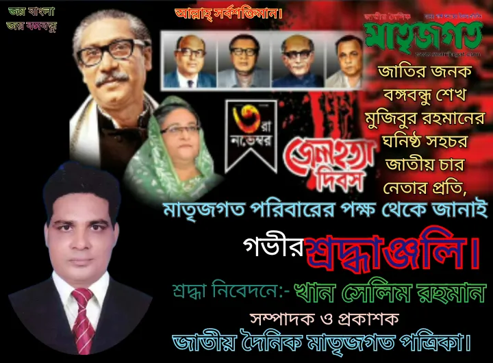 আজকের এই ৩'রা নভেম্বর জেলহত্যা দিবসে, সর্বকালের সর্বশ্রেষ্ঠ বাঙ্গালি, মহান স্বাধীনতা স্থপতি, জাতির জনক বঙ্গবন্ধু শেখ মুজিবুর রহমানের ঘনিষ্ঠ সহচর ও মুক্তিযুদ্ধের সংগঠক, জাতীয় চার নেতা'র প্রতি। মাতৃজগত পরিবারের পক্ষ থেকে জানাই, গভীর শ্রদ্ধাঞ্জলি।