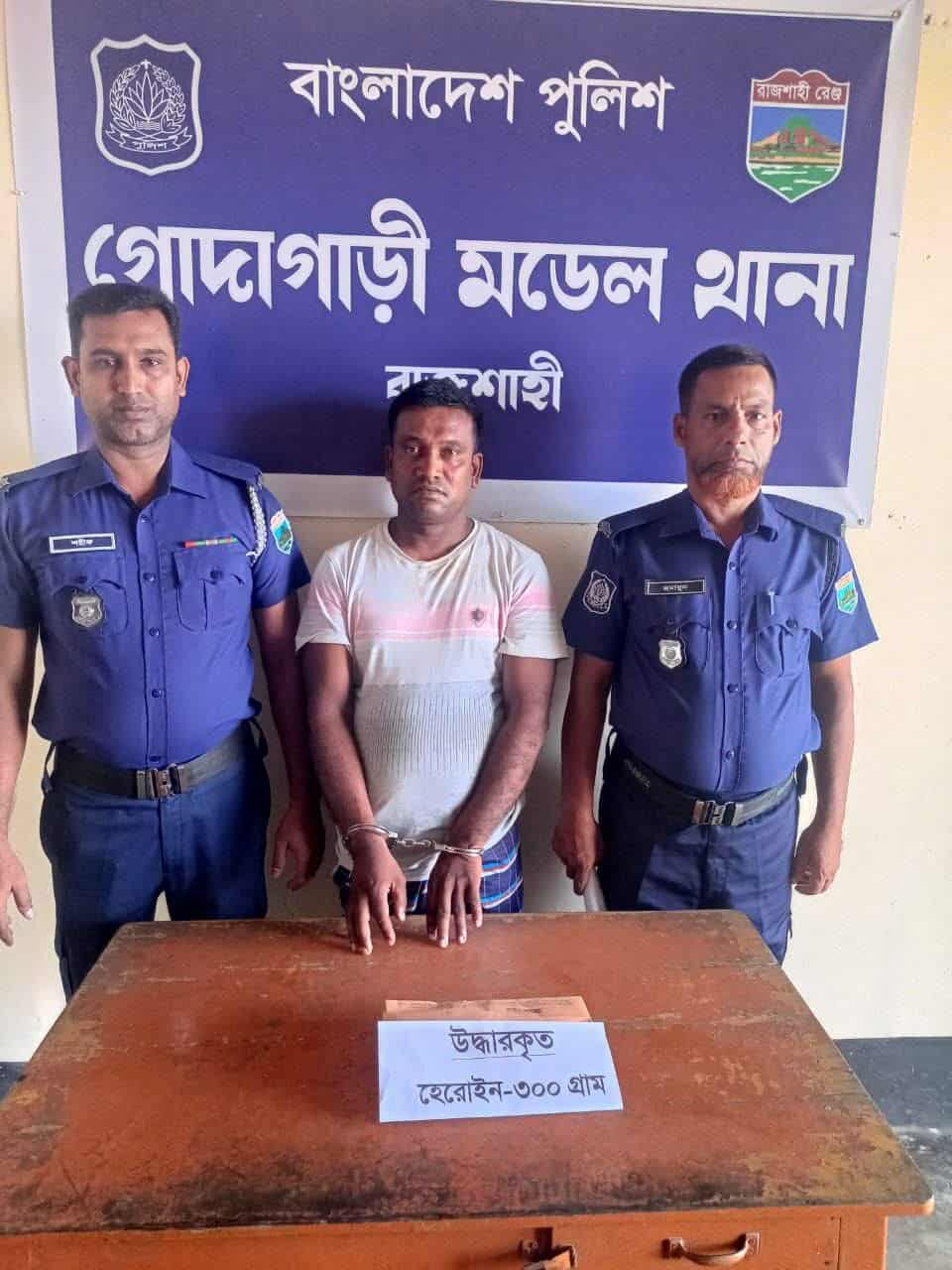 শনিবার (২০ সেপ্টেম্বর) দুপুরে রাজশাহীর গোদাগাড়ী উপজেলার মাটিকাটা ইউনিয়নের সাহাব্দীপুর গ্রামের নুরী ব্রিকস ফিল্ডের সামনে থেকে ৩০০ গ্রাম হেরোইনসহ তাকে গ্রেফতার করা হয়। গ্রেফতারকৃত ব্যক্তি হলেন, গোদাগাড়ী পৌর এলাকার বারুইপাড়া
