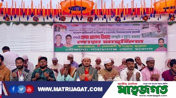 মুহাঃ সানাউল্লাহ বেপারী সোনারগাঁ (নারায়ণগঞ্জ) প্রতিনিধিঃ নারায়ণগঞ্জ জেলা ছাত্রদলের উদ্যোগে বিএনপির চেয়ারপারসন ও সাবেক প্রধানমন্ত্রী দেশনেত্রী বেগম খালেদা জিয়ার সুস্থতা কামনায় দোয়া মাহফিল অনুষ্ঠিত হয়েছে। মঙ্গলবার সোনারগাঁ উপজেলার সাদিপুর ইউনিয়নের